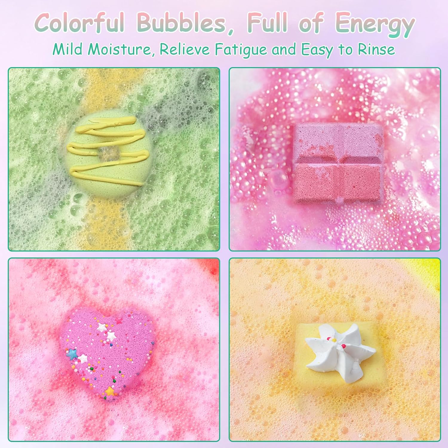 🛁HIGH QUALITY-Our bath sets for women gifts are carefully made with high-quality different extracts, the more reasonable formula will bring you a more comfortable bathing experience. This bath bombs for girls is fresh and gentle, and won’t stain your bathtub. The plant oils in this kids bath bombs gift set are easily absorbed and help deliver other ingredients deep into the skin, leaving all skin types feeling soft and soothed.
