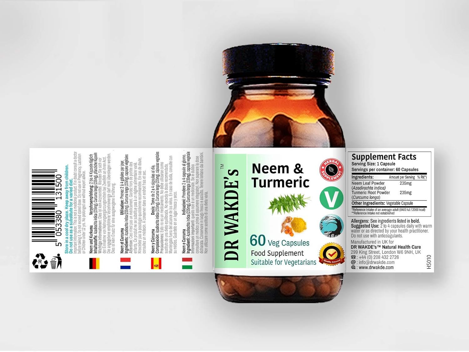 Neem & Turmeric Capsules are suitable for those looking to integrate popular Neem leaf & Turmeric root as a daily supplement to their diet. DR WAKDE’S Neem & Turmeric Capsules are particularly suited to vegans and vegetarians due to the HPMC capsule used.