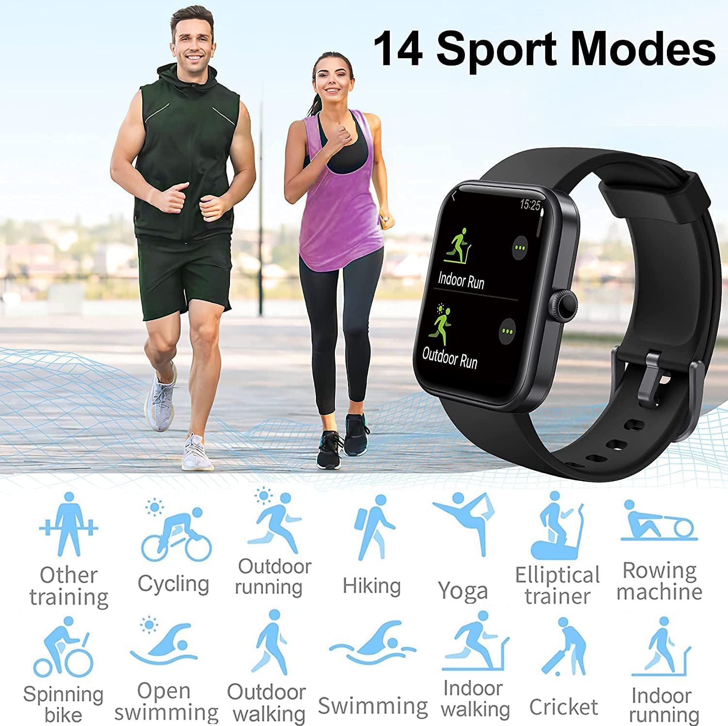 Fashion Smart Watch Main Features: Built-in Alexa: You can control device (device with amazon Alexa) to play music, hear news, check the weather, control your smart device, and control your smart life. Display type: 1.69-inch (37.0*43.8mm) color screen, Full Touch screen 240*280 Pixel Band size: Long band: 120.7*22*4.3mm; Short Band: 82.5*22*4.3mm Weight: 42g Waterproof Level: 5ATM Compatible system: iOS 9.0 & Android 6.0 or above, Bluetooth up to 5.2. Application: VeryFit APP (Scan the QR code manually or download it through your mobile Android market or iPhone APP Store) Battery: 300mAh battery, Charging <=2.5 hours, Working time>=10hours, Standby time>=35hours Charge the watch to activate it before first use. The original power adapter must be used for charging. 14 Sport Modes & 5ATM Waterproof E-Deals Smartwatch has 14 comprehensive sports modes, covering practicing yoga, swimming, jogging, walking, cycling, hiking, doing cricket yoga, elliptical machine, etc. E-Deals fitness tracker is able to automatically recognize activity and create a virtual rival. You can track your data with 14 sports modes and get fast and easy access to data including exercise duration, number of steps, distance traveled, calorie burned, and more. Waterproof Smartwatch meets the international IP68 waterproof standard. No more worry when bathing, washing hands or swimming. 1.69″ HD Full Touch Screen & Custom Dial Face 1.69-inch HD Full Touch allows you to clearly read sports data and messages on the smartwatch. E-Deals Fitness watch supports personalized and customized dial interface. You can upload your favorite photo or download a picture from cloud image in the app ‘VeryFit’ as background to personalized it. Blood oxygen (Sp02) & Pressure Monitoring E-Deals fitness watch tracks your blood oxygen, pressure, heart rate when you wear it. It allows you to learn more about your health conditions in even greater detail. NOTE: Before use, the sensor is attached to the skin. Keep your body relaxed during the test. Don’t use it as a basis for medical diagnosis or treatment. After you start the SpO2/Stress/Heart Rate measurement, you had better not move your wrists or arms. E-Deals fitness watch can’t monitor blood pressure. It is only for stress measurement. Weather Forecast Connect your fitness watch to the ‘VeryFit’ app on your phone to synchronize the weather report from your mobile phone for the following 3 days. Music Control Use your Smartwatch to view music and change tracks without taking your phone out of your pocket. Find “Music” in the app Veryfit and tap it to conveniently control the music during training (Play/Pause, Next/Previous Song, and Volume Control). Sleep Monitoring Smartwatch can monitor your sleep quality and sleep time (deep/light/awake/asleep) and synchronize the data to your app Veryfit in cellphone. A comprehensive sleep quality analysis helps you to adjust your way of life to enjoy better health. Smart Notification On your E-Deals Smartwatch, you can view SMS, Call notifications and Messages from Facebook, WhatsApp, Linkedin, Messenger, Instagram, Skype, Gmail, etc. The watch vibrates to alert you so you don’t miss any messages or calls even when your phone is in the silence mode. NOTE: You cannot call back and edit information. And please turn off ‘Do Not Disturb’ on your phone and fitness watch before using to make sure this feature works properly. Female Health Care Enter details concerning menstruation date in the app, and it will remind you in advance to prepare for the next menstruation and ovulation. Find Your Phone Set the fitness tracker to find your phone in app ‘VeryFit’. Tap the ‘find phone’ icon in fitness tracker, and your smartphone will ring and vibrate (even if set to silent) if it is within Bluetooth range.