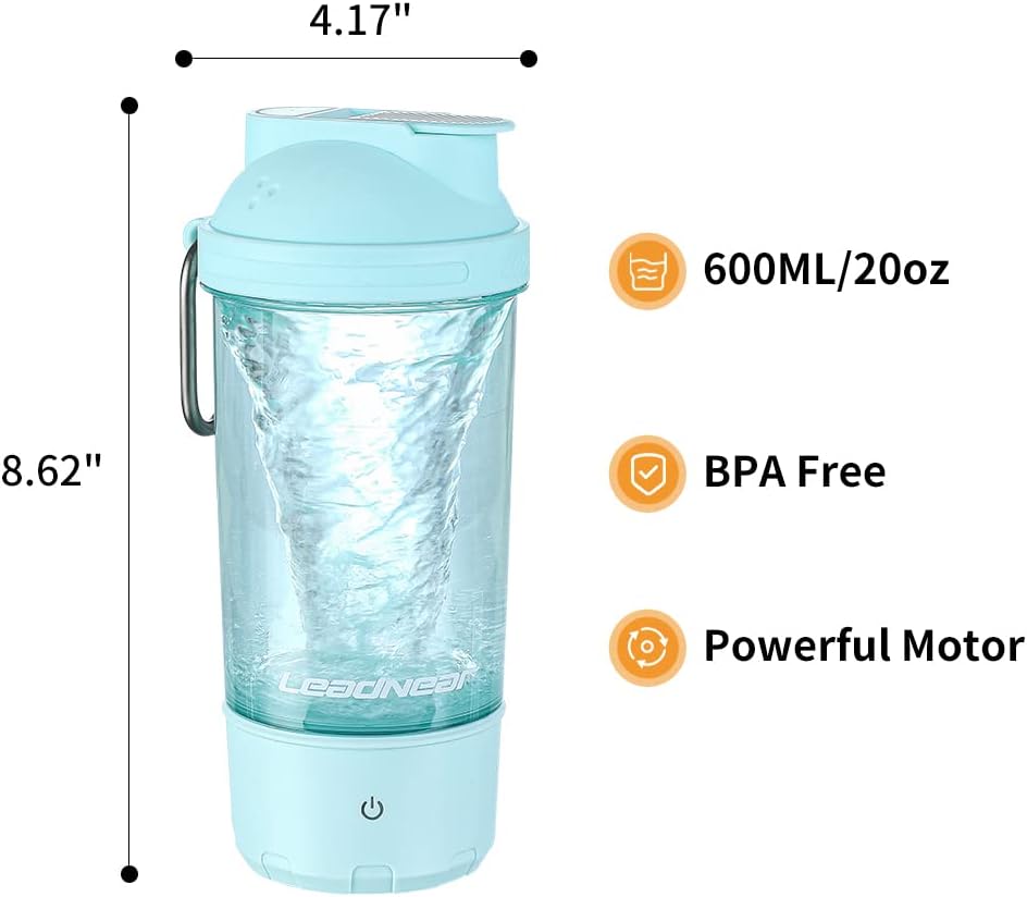 【Upgraded Material & Easy to Clean】LeadNear bottle cup body Is made of food-grade 100% Tritan material, BPA-Free. Tritan gives you the transparency of glass and the lightness of plastic, which is shatter-proof and odor-resistant, so you won’t have to worry about any lingering smells.EQURA protein shaker is easy to clean, which is to add water and detergent into the electric protein shake cup and press the on/off button. After a few seconds, rinse the vortex shaker and it will be thoroughly cleaned done