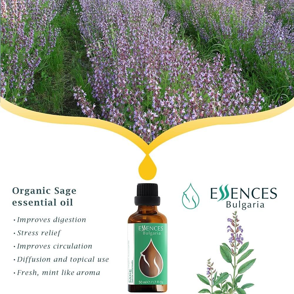 Essences Bulgaria Organic Sage Essential Oil 10ml | Salvia officinalis | 100% Pure and Natural | Undiluted | Therapeutic Grade | Family Owned Farm | Steam-Distilled | Non-GMO | Vegan (Sage, 10 ml)