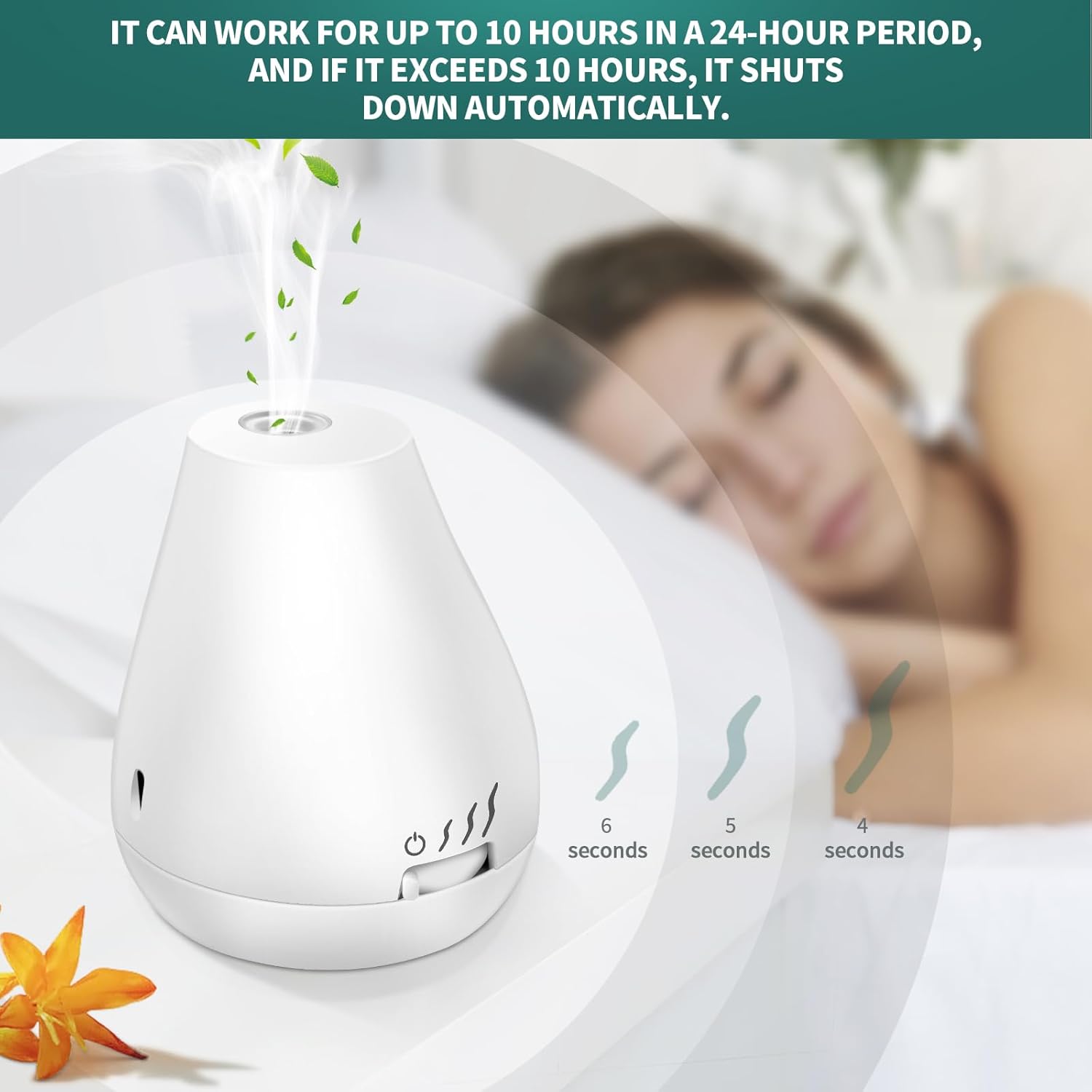 The diffuser can work for 10 hours, after 10 hours it will automatically switch off to prevent the scent from overpowering. It will restart after 14 hours of resting. (You can also adjust the gear button)