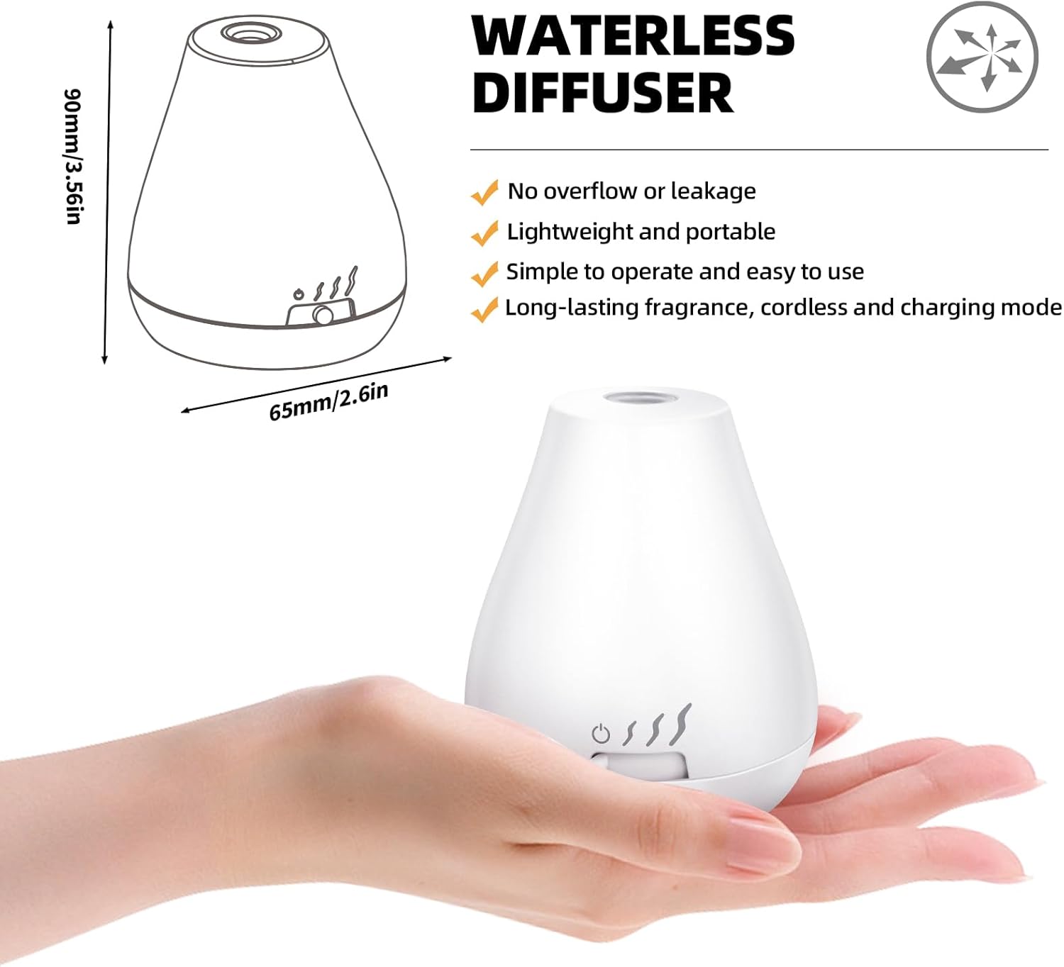 【Waterless and Portable】This essential oil diffuser features an innovative waterless design, which means no water is needed to directly atomise the essential oils, making the aroma more intense. It is battery-powered (rechargeable) and portable, so you can use it anytime and anywhere.