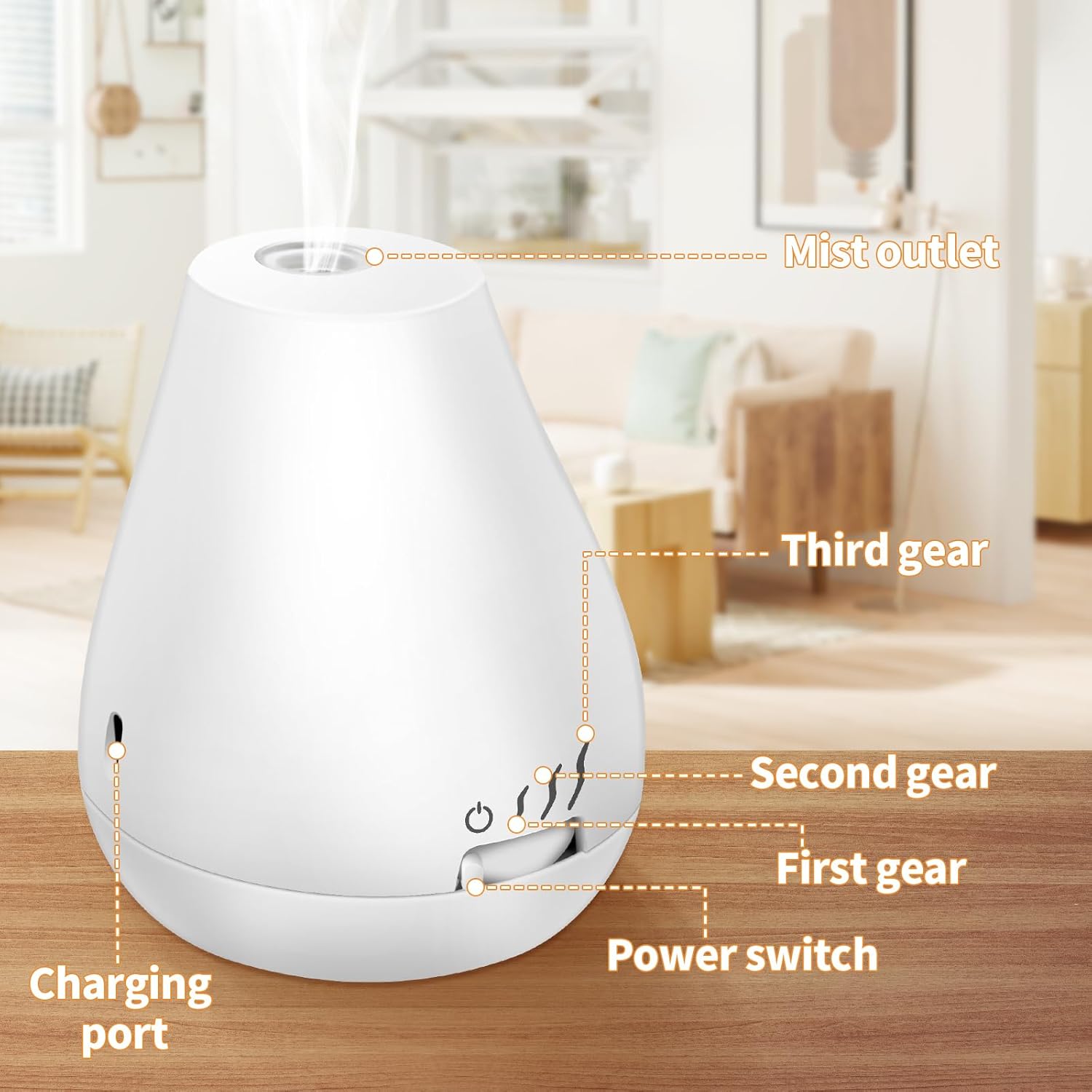 【One Touch Enable & 3-Stage Atomisation Design】 The essential oil diffuser is very easy to use, just flick the gear button at the bottom. It has 3 levels of atomisation, corresponding to different modes. In low mode, the diffuser atomises for 4 seconds every 17 minutes; in medium mode, it atomises for 5 seconds every 12 minutes; and in high mode, it atomises for 6 seconds every 10 minutes.