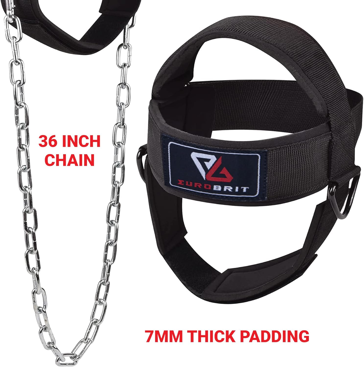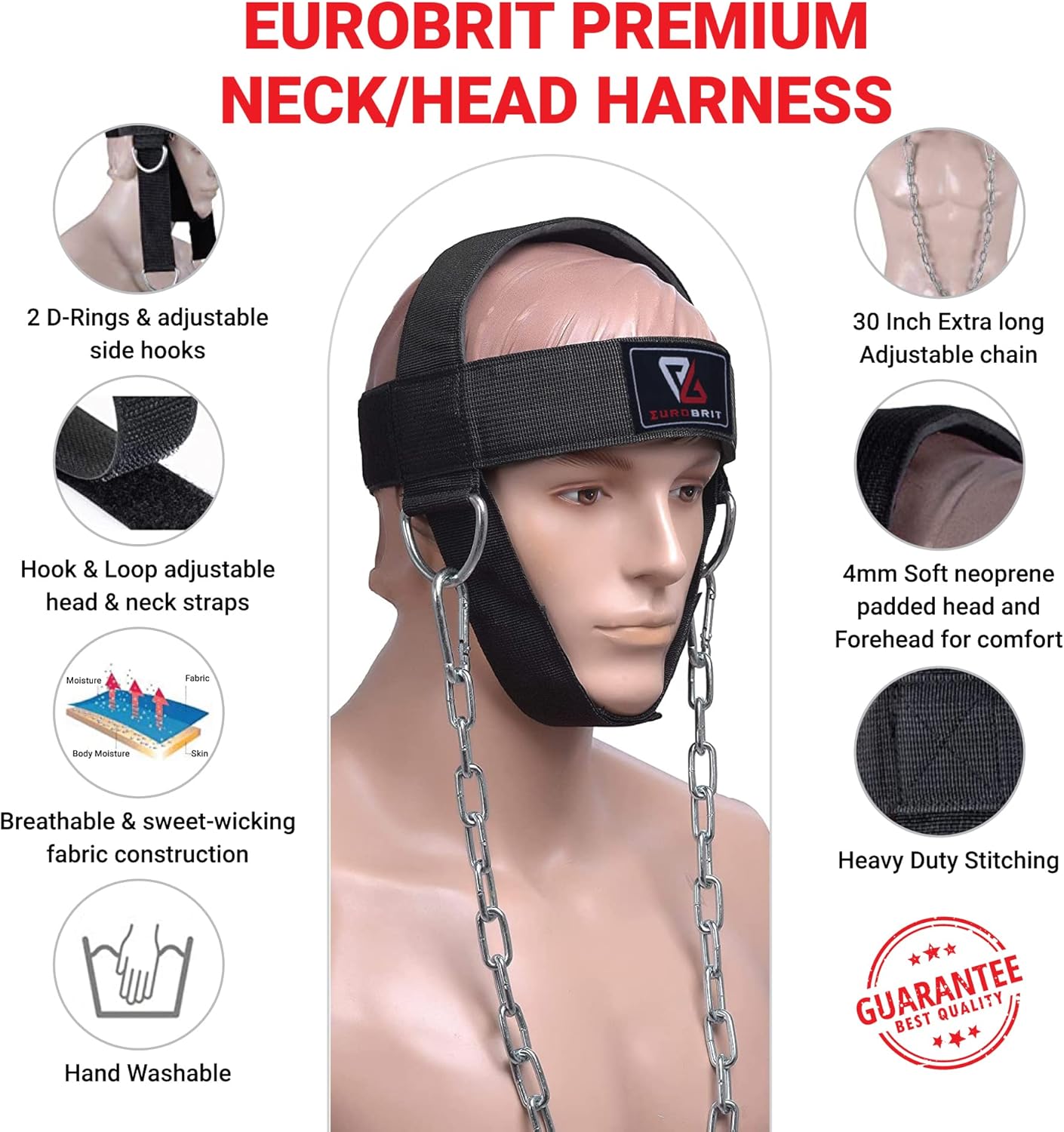Eurobrit Neck Trainer and Harness for Weight Lifting| Powerlifting Neck Weight Trainer | Neck exerciser gym equipment with Adjustable Long Steel padded training Head harness for resistance workout
