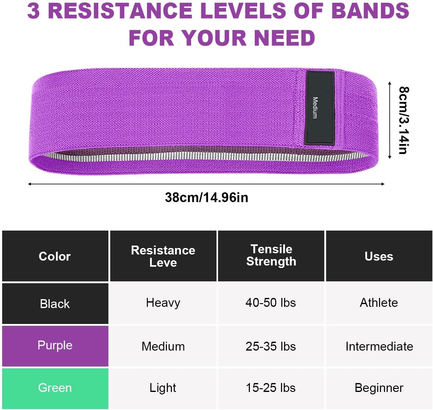 Three Different Resistance Level:The set of hip bands with 3 colors are tailored to 3 different resistance levels: Green (15~25lbs), Purple (0.45mm/25~35lbs), Black (40~50lbs). These elastic bands can come in handy whether you are a beginner or an experienced user. Customized for all kinds of fitness groups, buy a set, which can be used by the whole family.