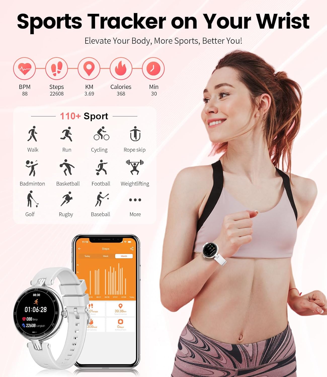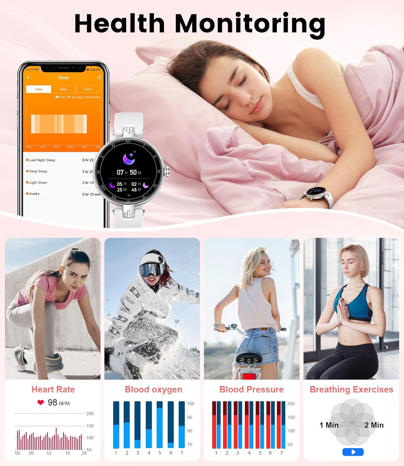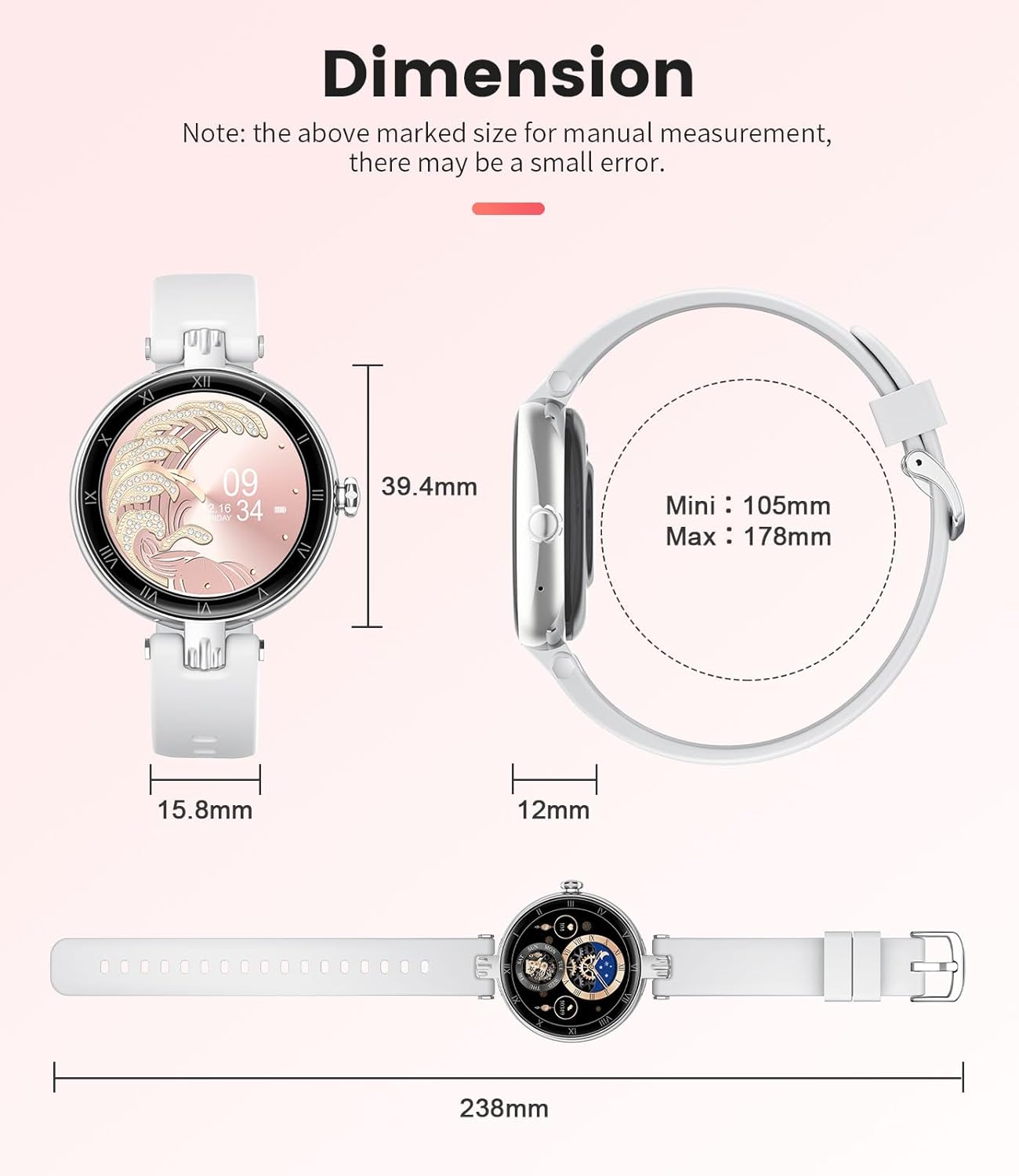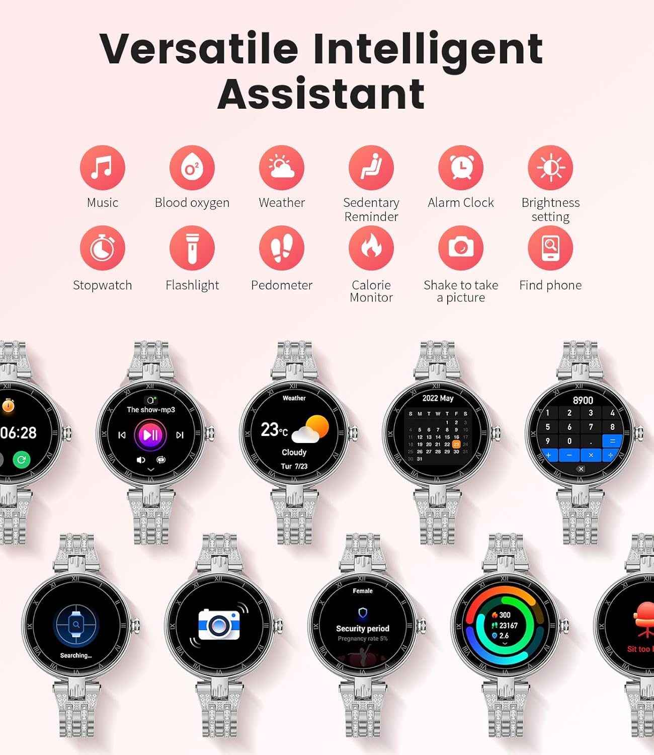 FEMALE FUNCTION & MORE PRACTICAL FEATURES: This smartwatch for women is not just a fashionable accessory but also a modern smart assistant for women. It features a menstrual tracking function, allowing you to record and calculate your menstrual cycle. By providing data and reminders, it helps you know your cycle and prepares you for upcoming periods. It’s a helpful tool for managing your life. Moreover, it has voice assistant, weather, calculator, remote camera, music play, stopwatch functions.