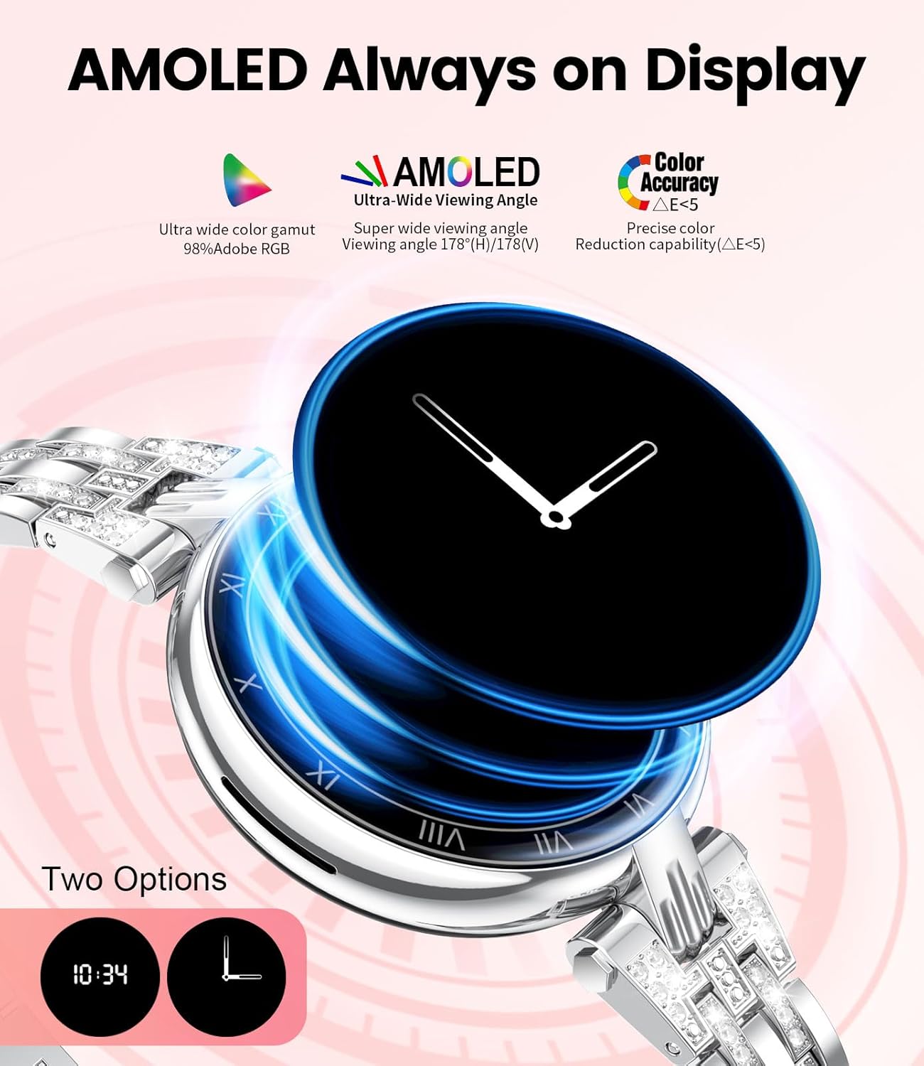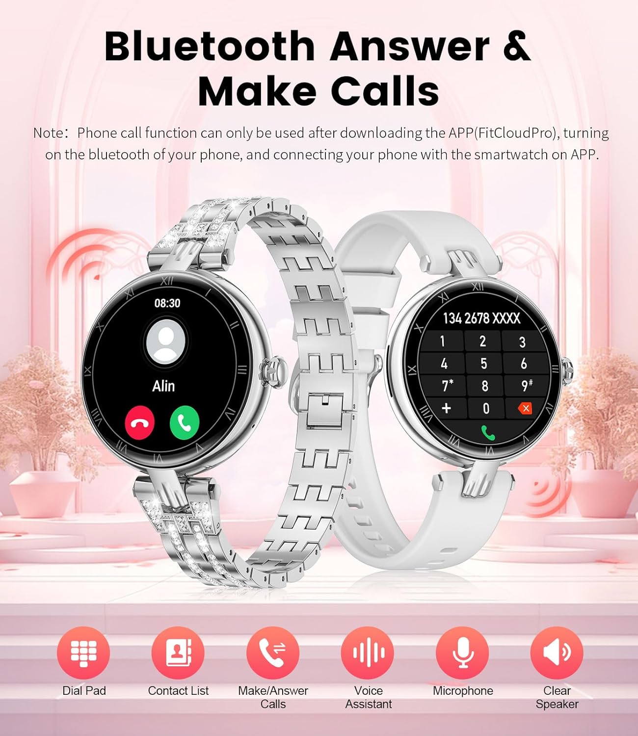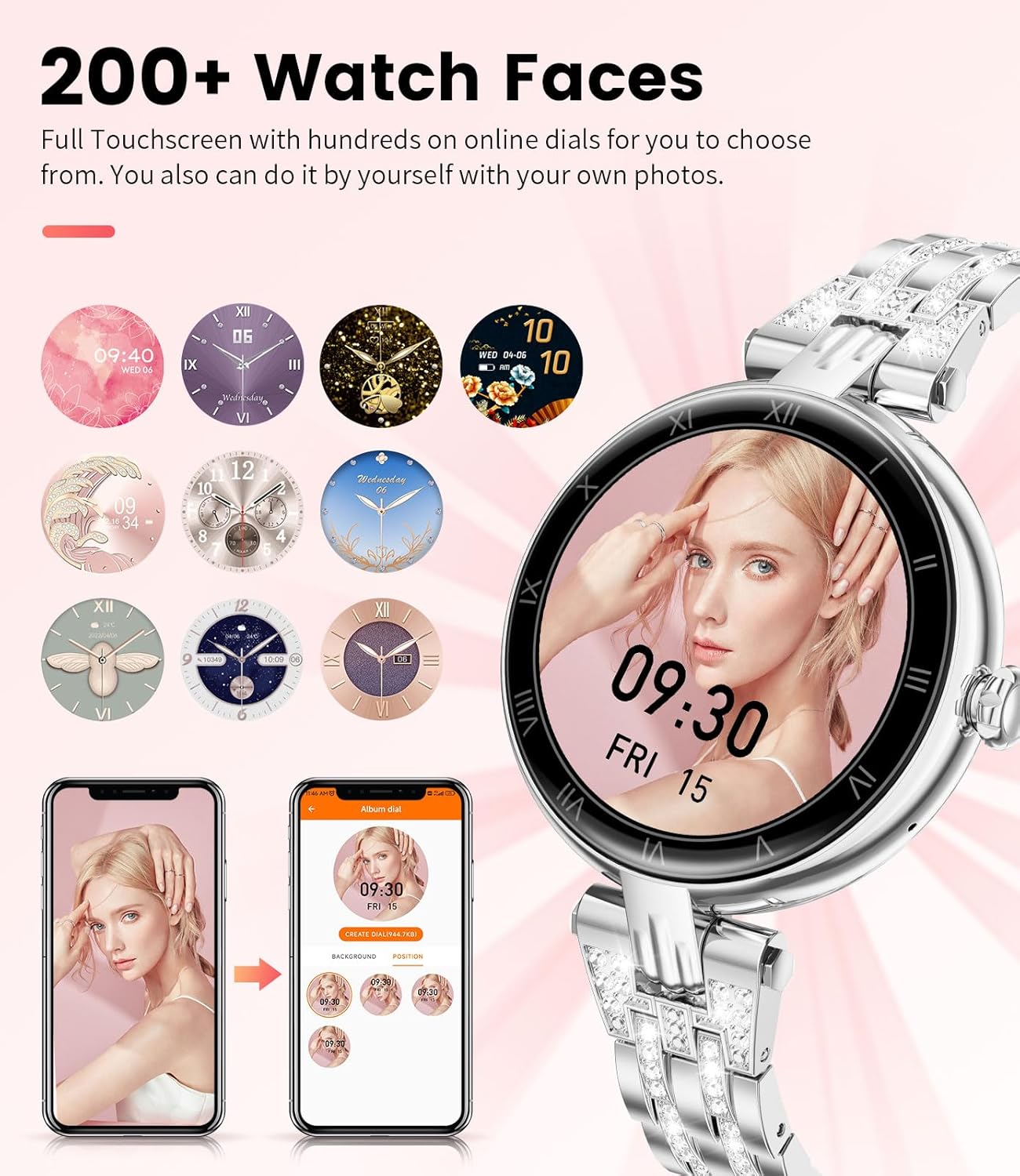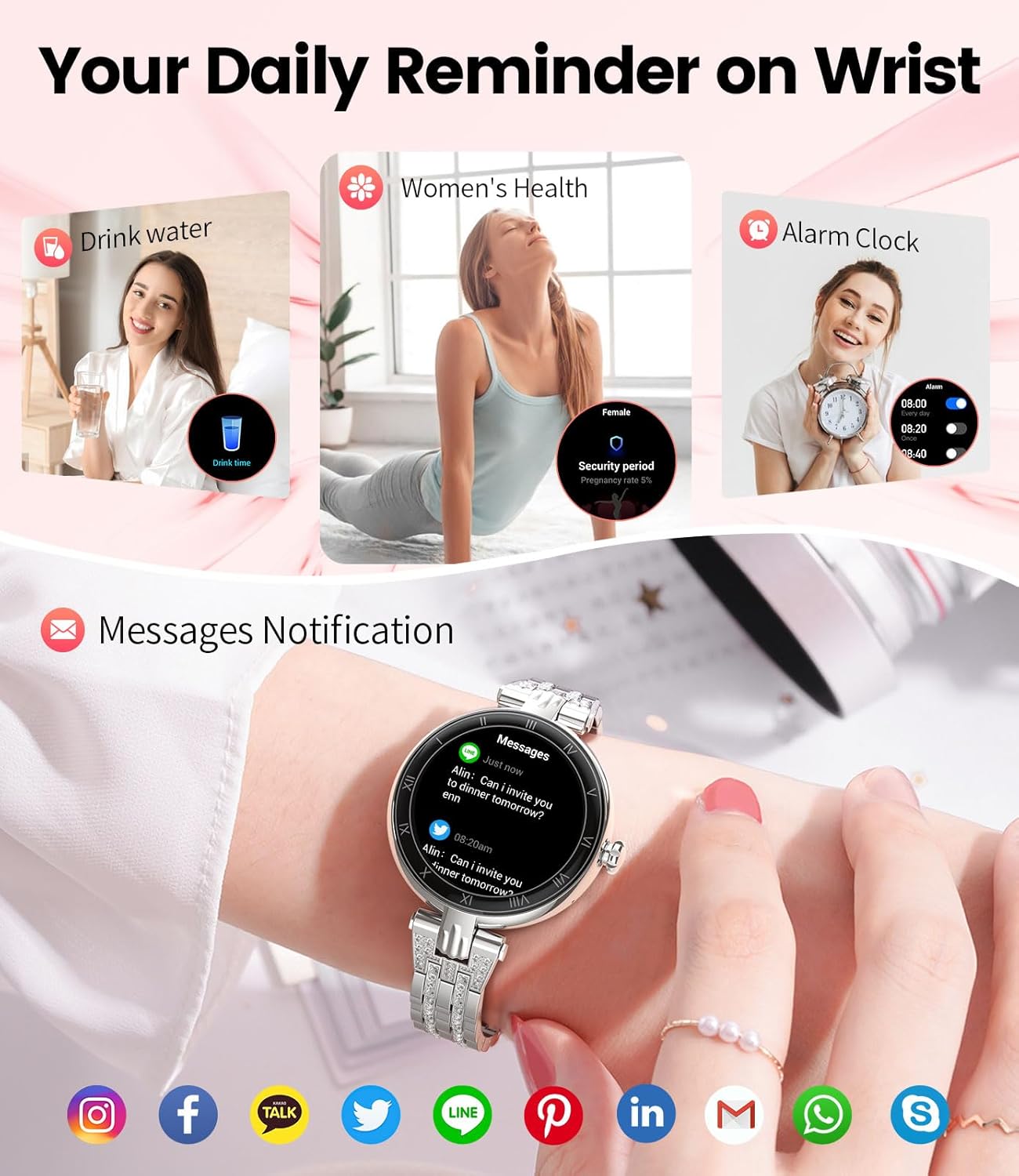 FEMALE FUNCTION & MORE PRACTICAL FEATURES: This smartwatch for women is not just a fashionable accessory but also a modern smart assistant for women. It features a menstrual tracking function, allowing you to record and calculate your menstrual cycle. By providing data and reminders, it helps you know your cycle and prepares you for upcoming periods. It’s a helpful tool for managing your life. Moreover, it has voice assistant, weather, calculator, remote camera, music play, stopwatch functions.