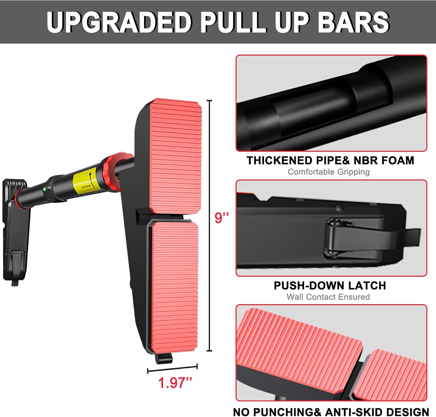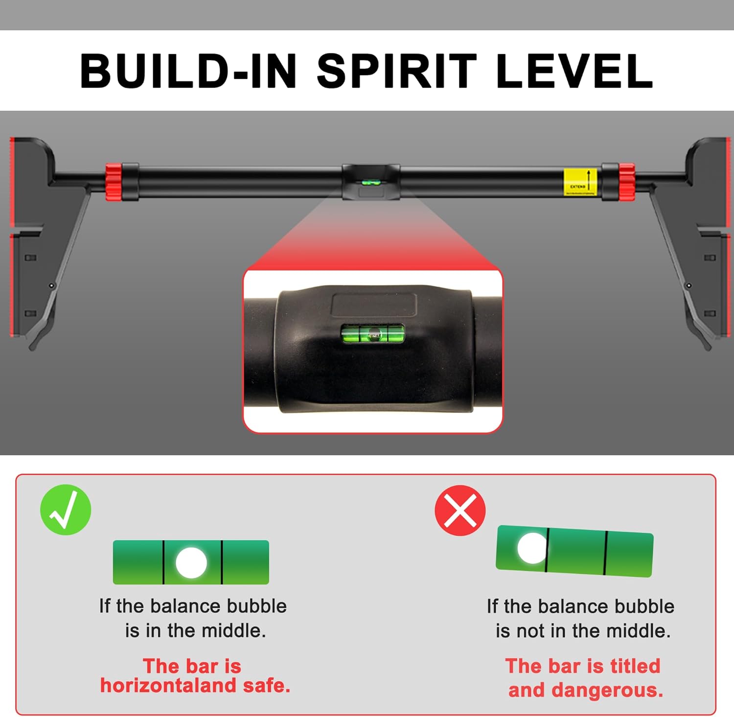 Robust Design: Built with a scientifically engineered structure, our pull-up bar ensures stability and supports up to 880 lbs when properly mounted. For safety, stop extending the bar when you see the exclamation point sign.