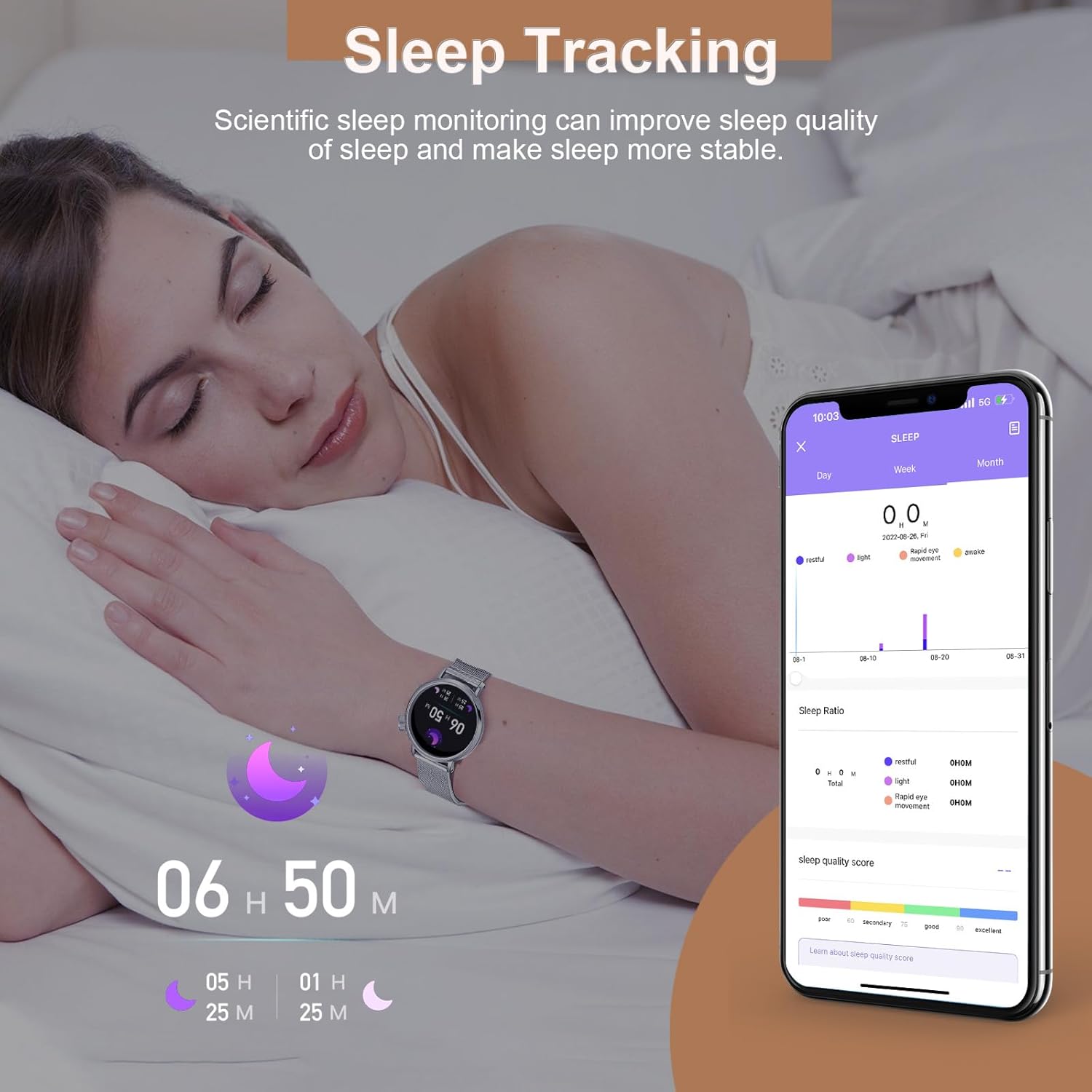Smart Watch for Women with Call Function 1.32” Full Touch Ladies Fitness Tracker Watch with Female Health Tracking Blood Oxygen Heart Rate Sleep Monitor Waterproof Sports Watches for Android IOS 2023 New upgraded 1.32” Large Screen Ladies Smart Watch FMK Ladies Smart Watch is equipped with a large 1.32” round colourful screen with a 360 x 360 resolution, which is enhances the whole experience of using and makes the smartwatch easier to use and readn.Addition, 150+ watch dials can be used,and the watch wallpaper can be DIY, connect your phone and design your own unique style. Smart Watch for Womens Make Answer Call and Receive Message After connecting to Bluetooth, you can directly make calls and answer calls on your watch.women smart watch with text and call supports quick communication, information reminder Facebook, WhatsApp, Instagram, Twitter, etc. .With all notifications displayed on your wrist and alerted by vibration. Women Sport Fitness Tracker Watch Women Fitness watch comes with 21 sports modes such as soccer, walking, running, swimming, hiking, cycling, mountaineering, yoga, etc.Accurately record your daily activities like number of steps, distance, calories burned. Also a unique reminder function of the menstrual cycle and pregnancy readiness are added,it helps you track daily activities with real time stats on smart watch women and get good fitness effects. Heart Rate Monitor and Sleep Monitor iPhone Android smart watch adopts the high performance sensors monitor, which can accurately monitor your heart rate. Heart rate monitor watch can be used as a real time monitor to detect your Heart Rate 24 hours a day, Always pay attention to your physical health.