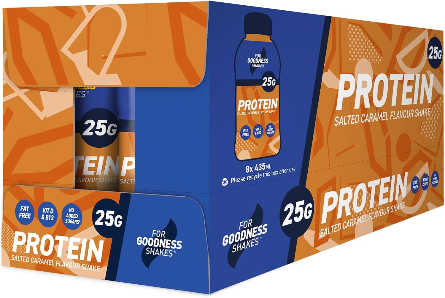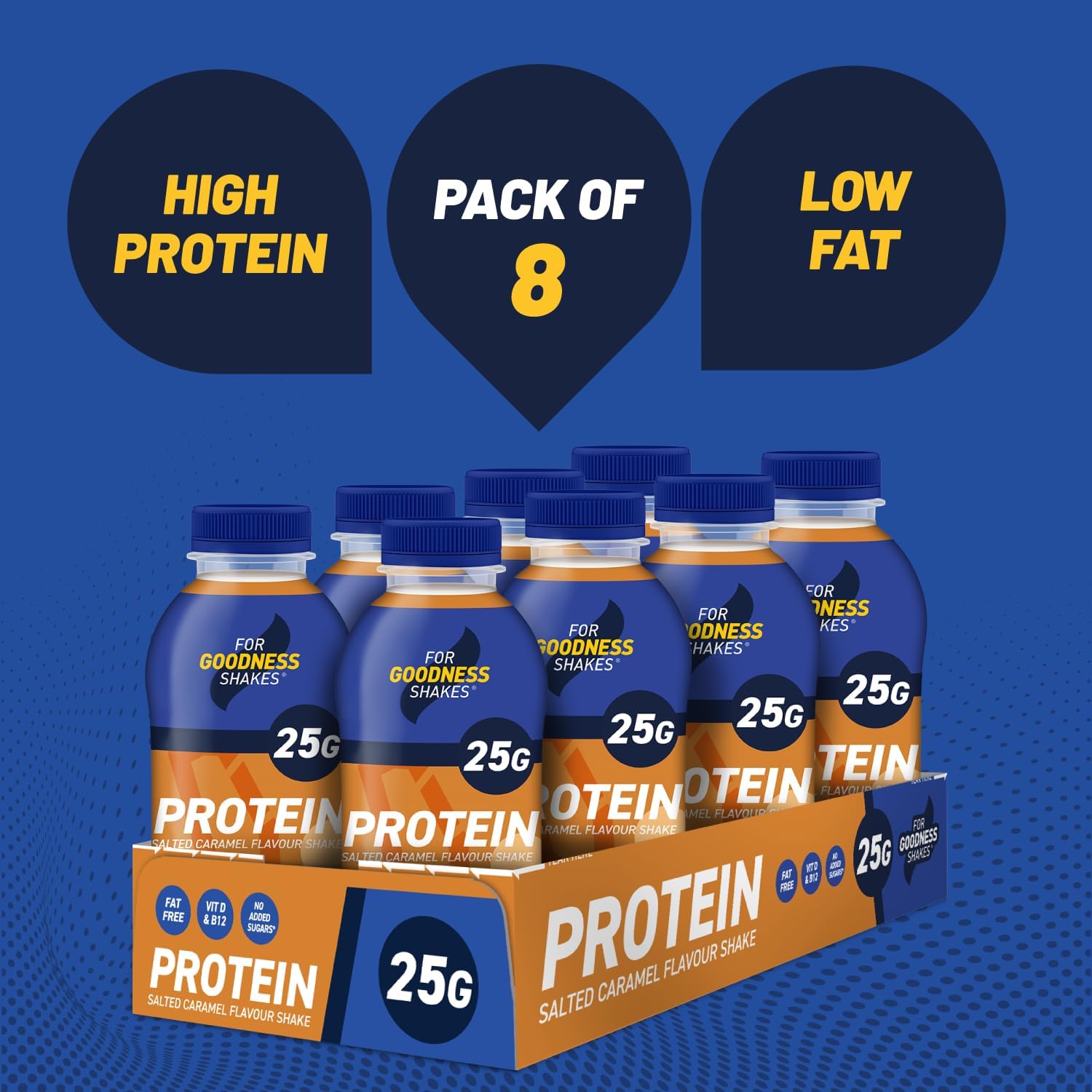 For Goodness Shakes Salted Caramel Drink, High Protein Fat-Free Ready-To-Drink, 25g Protein, Vitamin D & B-12, No Added Sugar, Low Calorie, 195 Kcal, Suitable For Breakfast, Pre, Post Workout, 8x435ml