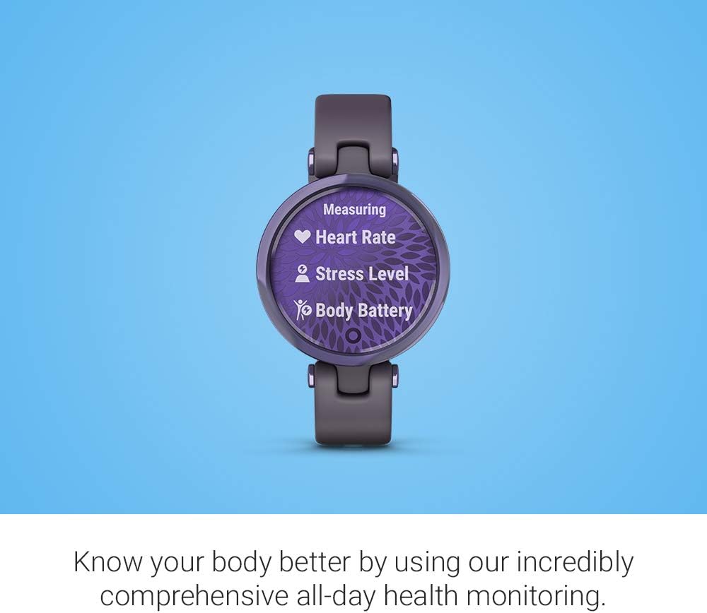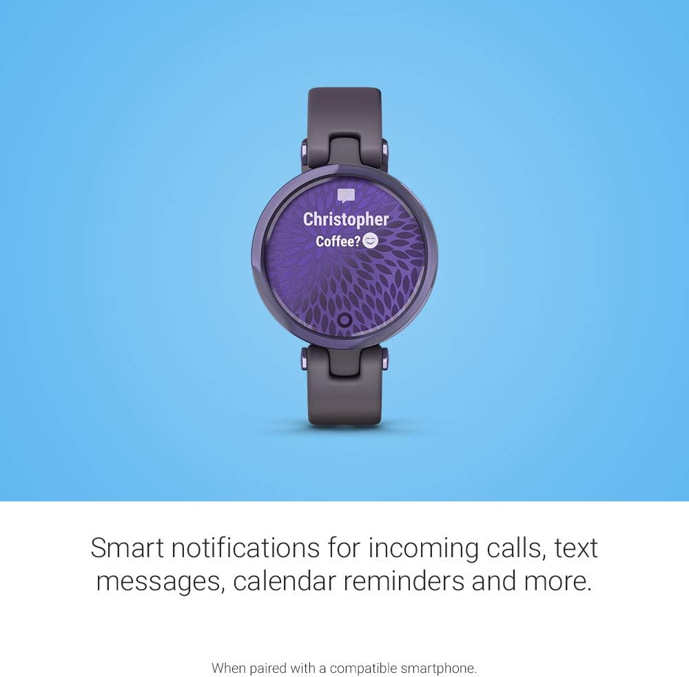 Garmin Lily, Stylish Small Smartwatch and Fitness Tracker, Sport Edition, Patterned Lens , Bright Touchscreen Display and up to 5 days battery life, Deep Orchid