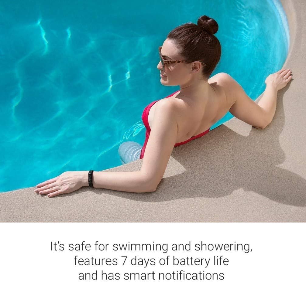 Battery life keeps up with you; lasts up to 7 days. Safe for swimming and showering, too. Display resolution: 48 x 128 pixels. Lens material: Polycarbonate