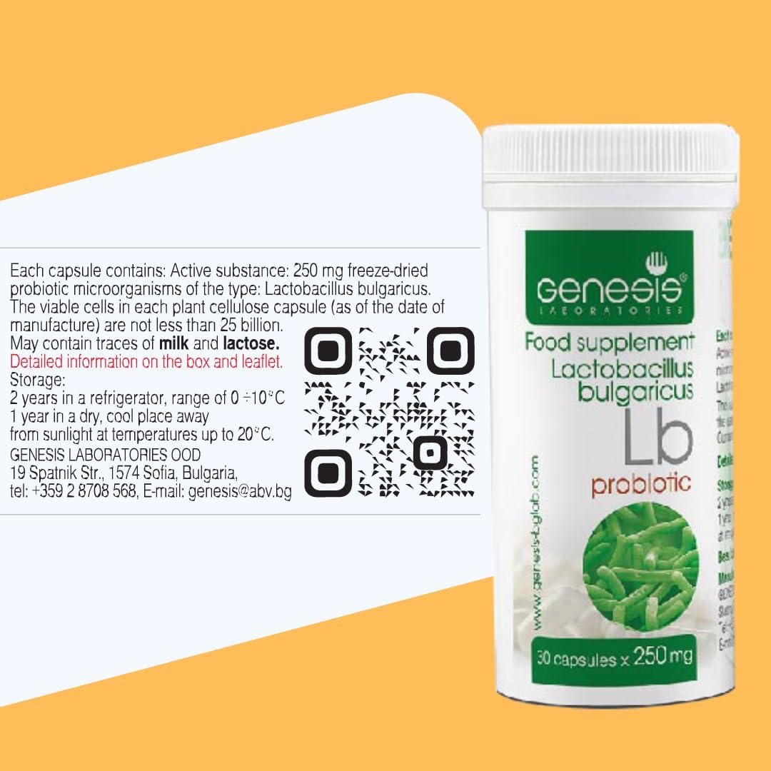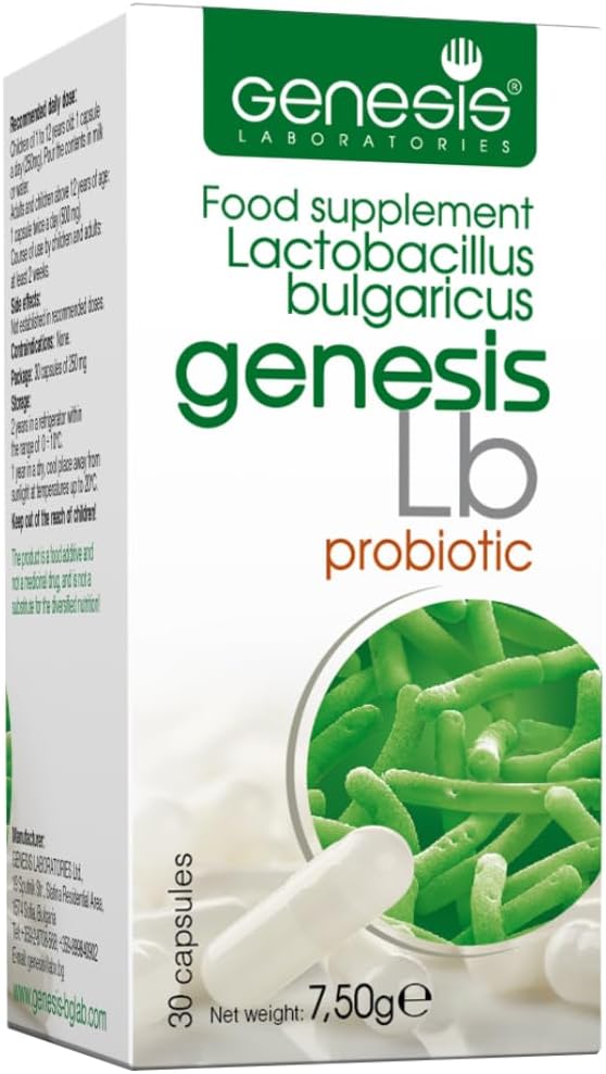 Genesis LB Probiotic with Lactobacillus Bulgaricus 30 capsules of 240 mg EACH CAPSULE CONTAINS: Active substance: 240 mg freeze-dried probiotic microorganism of types: Lactobacilus bulgaricus Streptococcus thermophilus The viabe cells in each capsule (as of date of manufacture) are over 2 billion. The lactobacillus bulgaricus strains which enter in the composition of the GENESIS LB PROBIOTIC capsules are isolated from natural sources in Bulgaria and are selected according to their health effect.The strains are are registered in the National Bank for Microorganisms and Cell Cultures.They are not genetically modified. INDICATIONS: Supports and regulates the balance of microbial flora in the gastro-intestinal tract after a treatment with antibiotics and other medicines , in dysbacteriosis and gastro-intestinal infections A positive factor for immune system stimulation, lowers the “bad” cholesterol and allergic reactions, detoxifies the organism. This product is not a medicine and is not a substitute for a varied diet! It does not contain GMO STORAGE CONDITIONS: Keep in the temperatures between 0 and 10 °C Keep out of reach of children! RECOMMENDED DAILY ALLOWANCE: For adults and children 1 to 3 capsules daily WHAT IS A PROBIOTIC? Probiotics are known as friendly or good bacteria. Definitions of the term probiotic have evolved over the years to today’s consensus, developed by the World Health Organization (WHO) and the Food and Agriculture Organization (FAO) of the United Nations: Probiotics are live bacteria which, when administered in adequate amounts, confer a health benefit on the host. While the general belief is that the only good bacteria are dead bacteria, that’s not true. It’s a common misconception that all bacteria are the enemy and should be eliminated. While there are plenty of bad bacteria, the majority of bacteria are critical to our survival