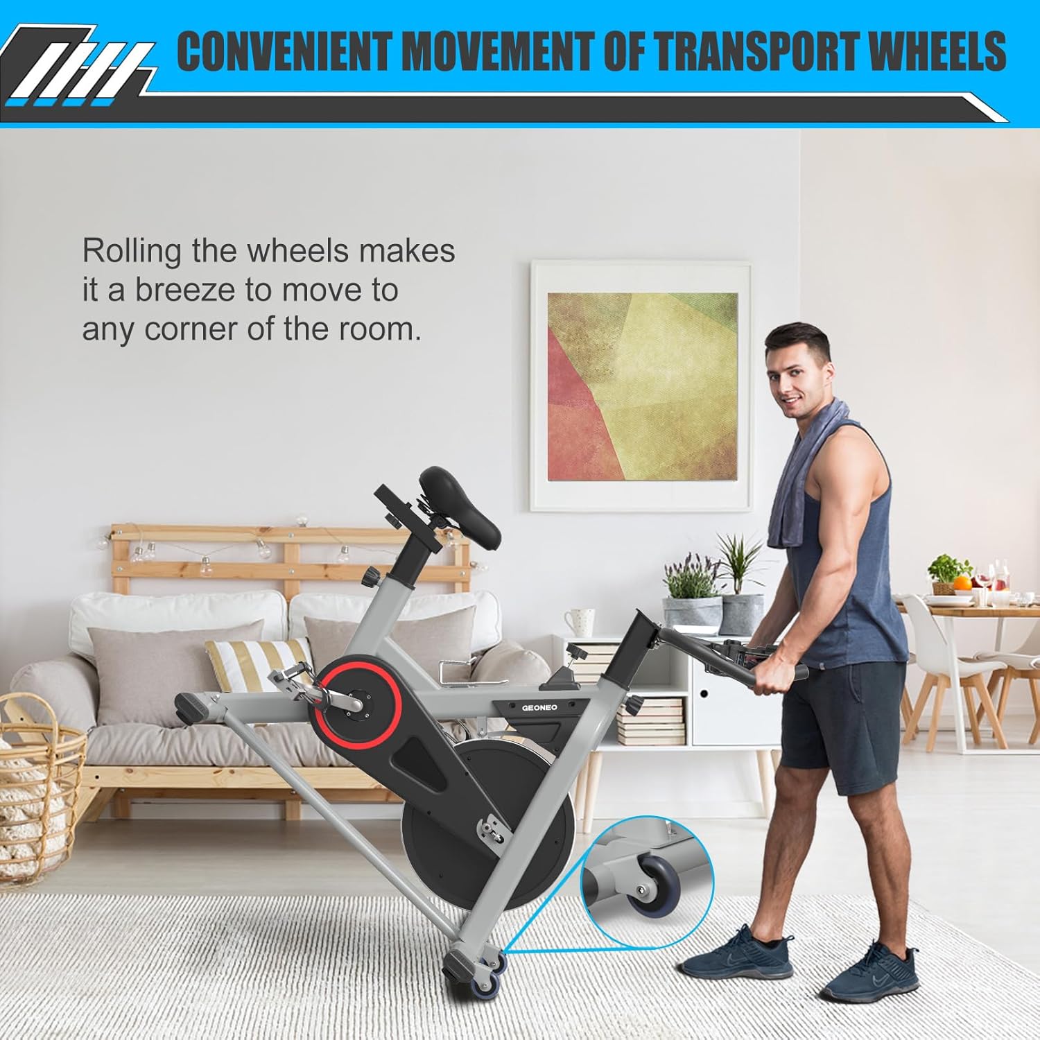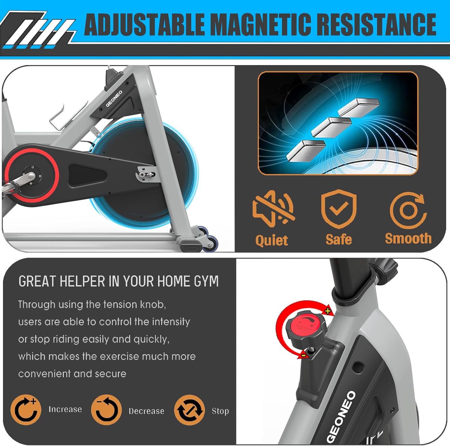 GEONEO Magnetic Resistance Exercise Bike for Home, Stationary Indoor Cycling Bike Cardio Gym with Ipad Holder and LCD Monitor,Silent Belt Drive & 35 LBS Flywheel silvery