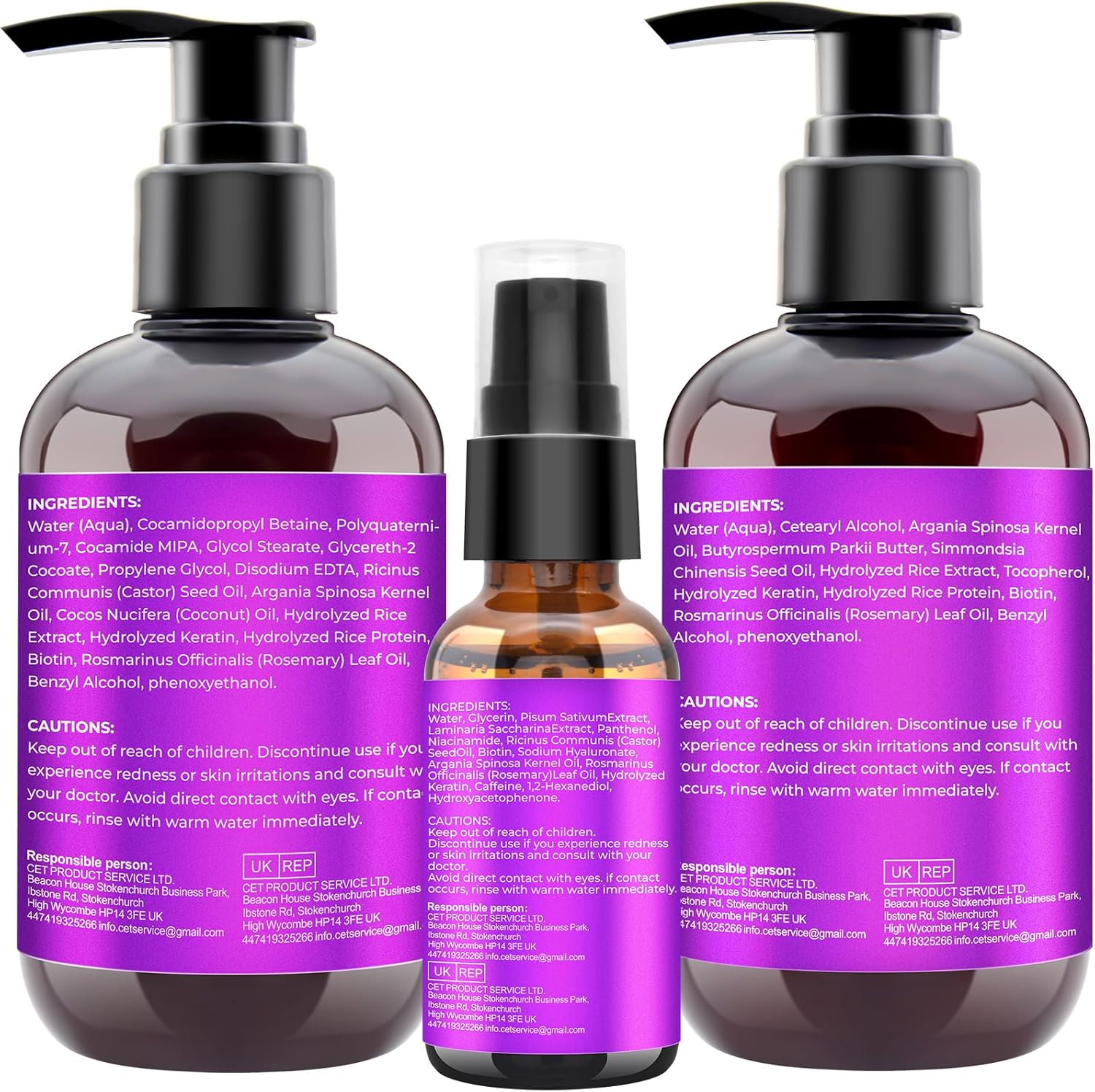 Our advanced formulation for Shampoo & conditioner is designed to help men and women achieve thicker, fuller looking hair and appearing naturally voluminous.Infused with a Powerful Blend of Biotin,Rosemary Oil,Coconut Oil,Argan Oil,Castor Oil,Jojoba Oil, Rice Protein,Keratin and Caffeine.