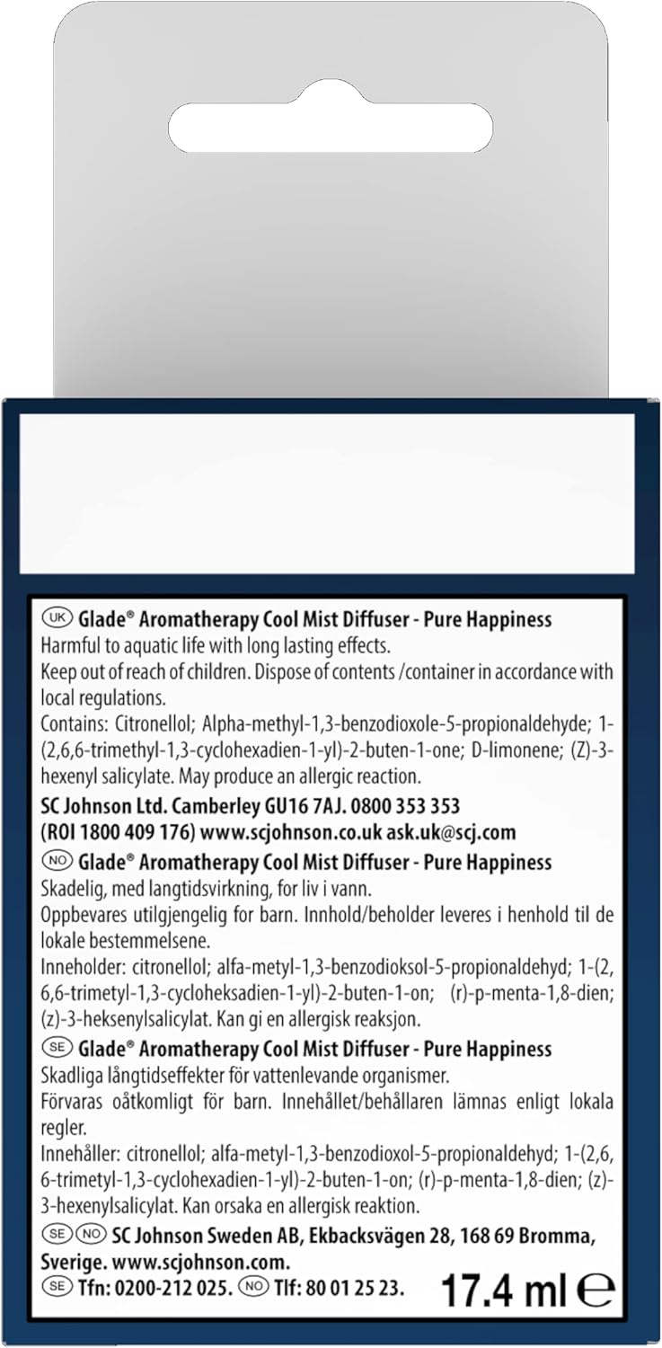 Brighten the mood with Glade Aromatherapy Cool Mist Diffuser Refill. Energize the atmosphere with a dual blend of essential oil-infused fragrance and enjoy the Pure Happiness. This aroma diffuser refill uses essential oils that are traced to the countries of origin. Own the mood with the blend of Brazilian Orange and North African Neroli blossom. Glade air freshener refill is consciously crafted for a life in balance, made without parabens, phthalates, nitro musks, artificial colors or dyes. Our room air freshener refill is a treat for your senses. When used with the Glade Aromatherapy Cool Mist Diffuser, it helps to relax yourself with air. There’s no mixing or mess, as the easy one-click diffuser refills are preblended and simple to insert into the device, while dual-wick technology ensures consistent performance for up to 60 days*. *on low setting