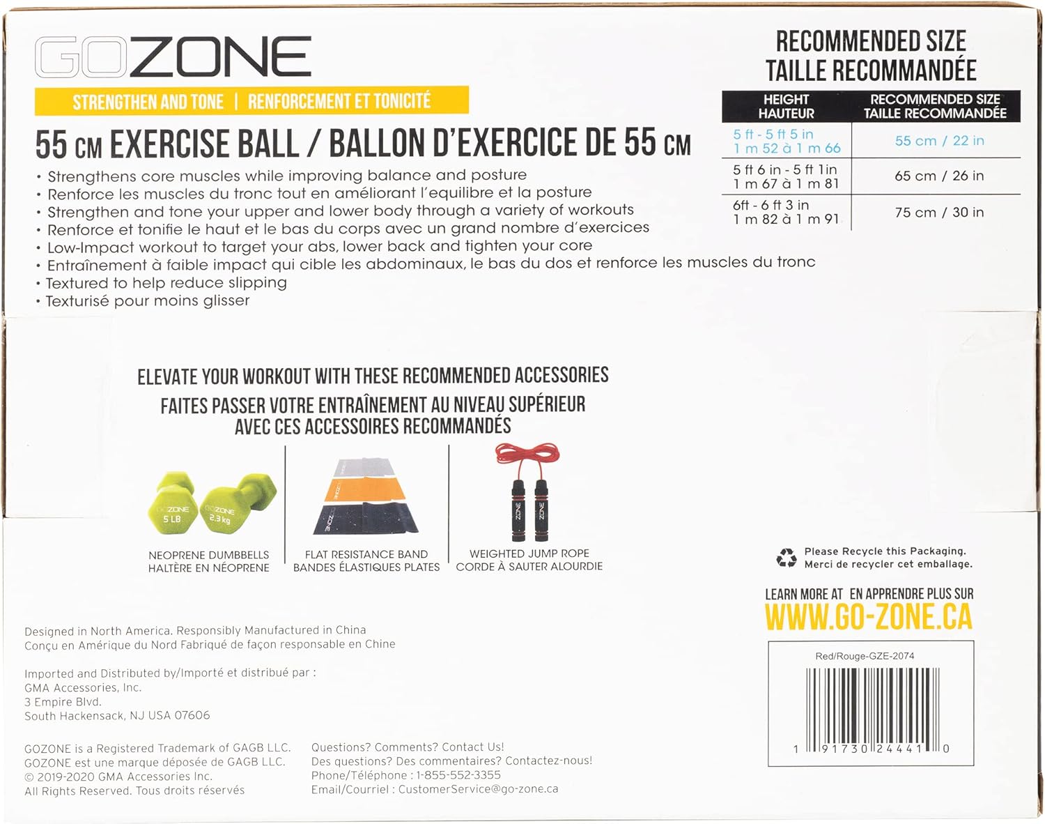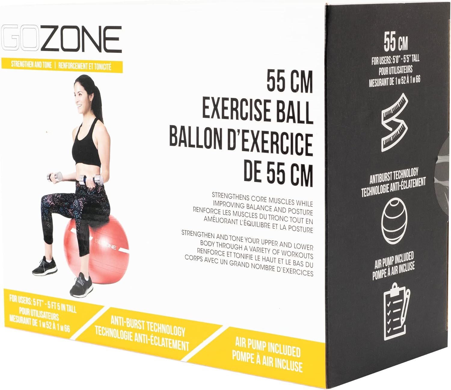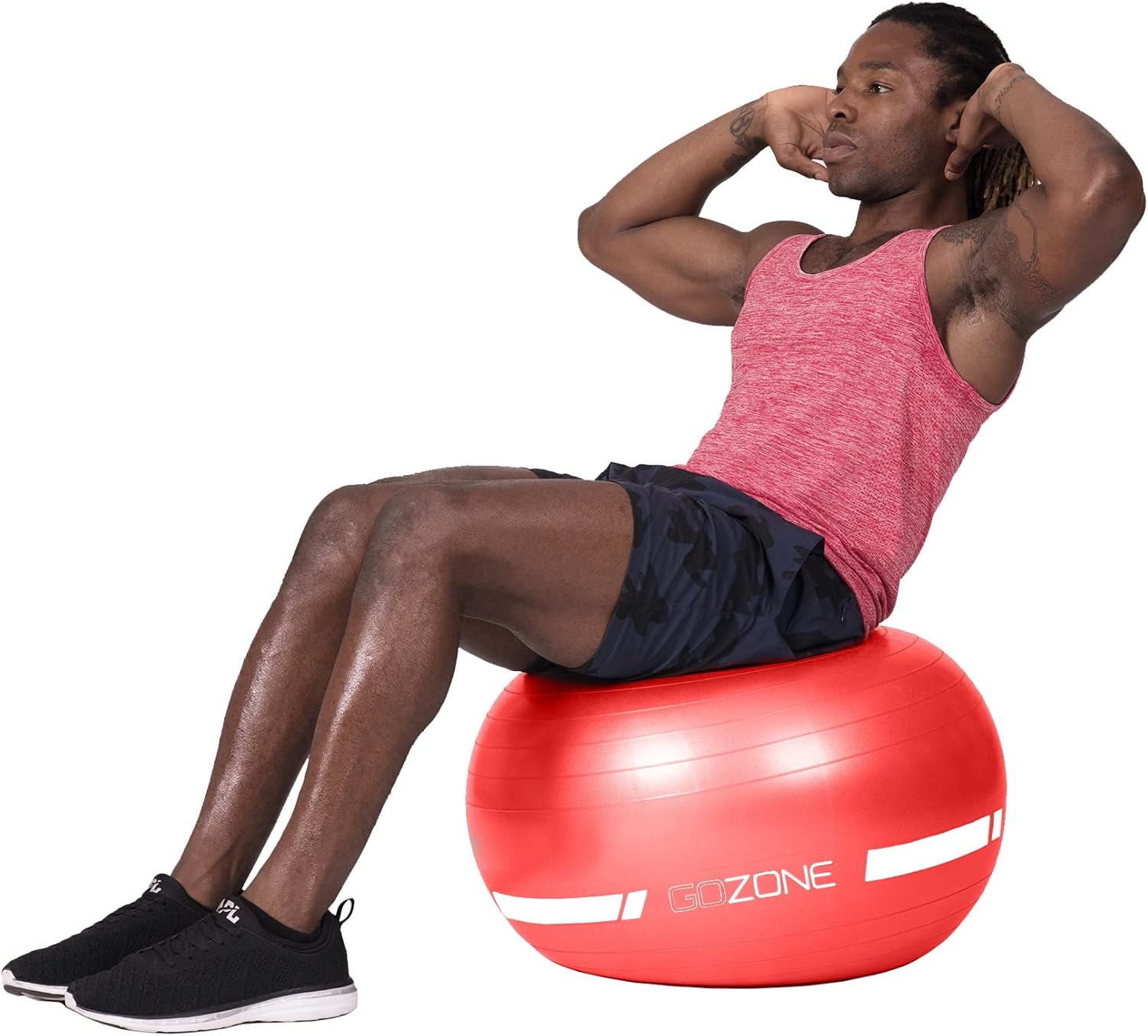 NON-SLIP DESIGN & ANTI-BURST: The GoZone exercise ball is safely designed with textured nonslip surface of this 55cm red coloured and black detailing exercise ball. Use this fantastic piece of equipment home, in the gym, or take it outside for a change of scenery! With the anti-burst technology, you never have to worry about it bursting under any type of pressure it endures, keeping you worry free!