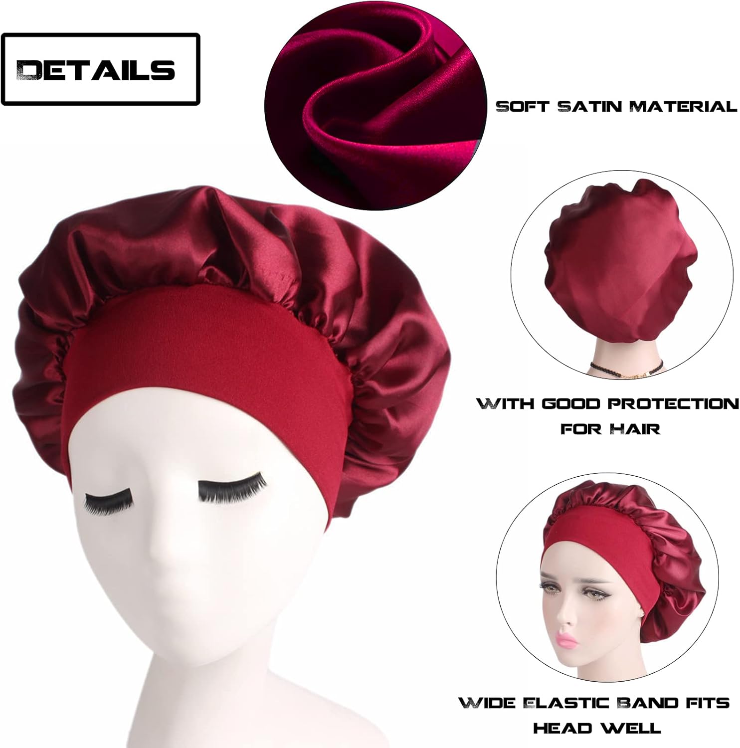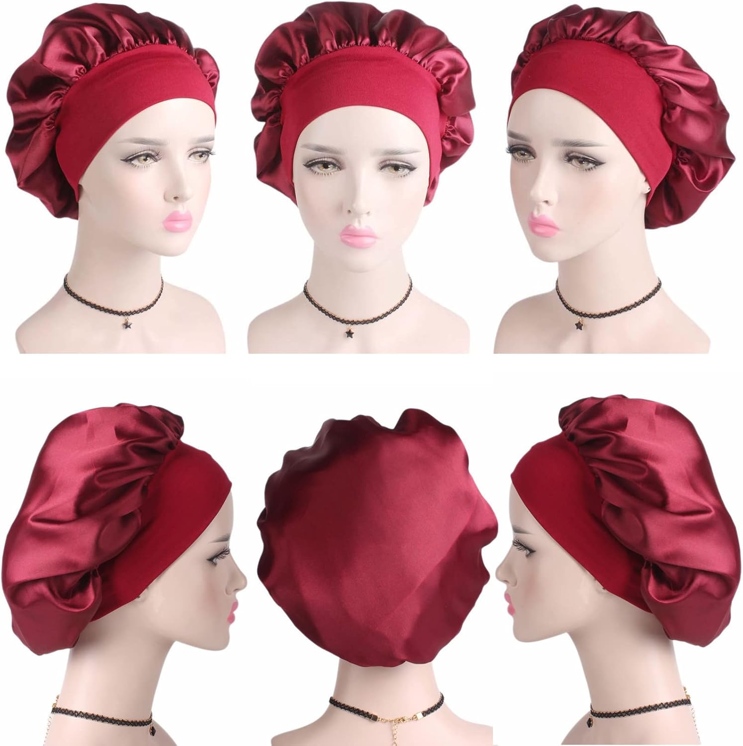 Hair Bonnet for Sleeping, Wide Band Satin Bonnet, Night Sleep Cap Silk Bonnet for Women Girls, Hair Care Sleeping Head Cover Elastic Hat Hair Bonnet for Black Hair Curly Hair (2pcs Black + Wine)
