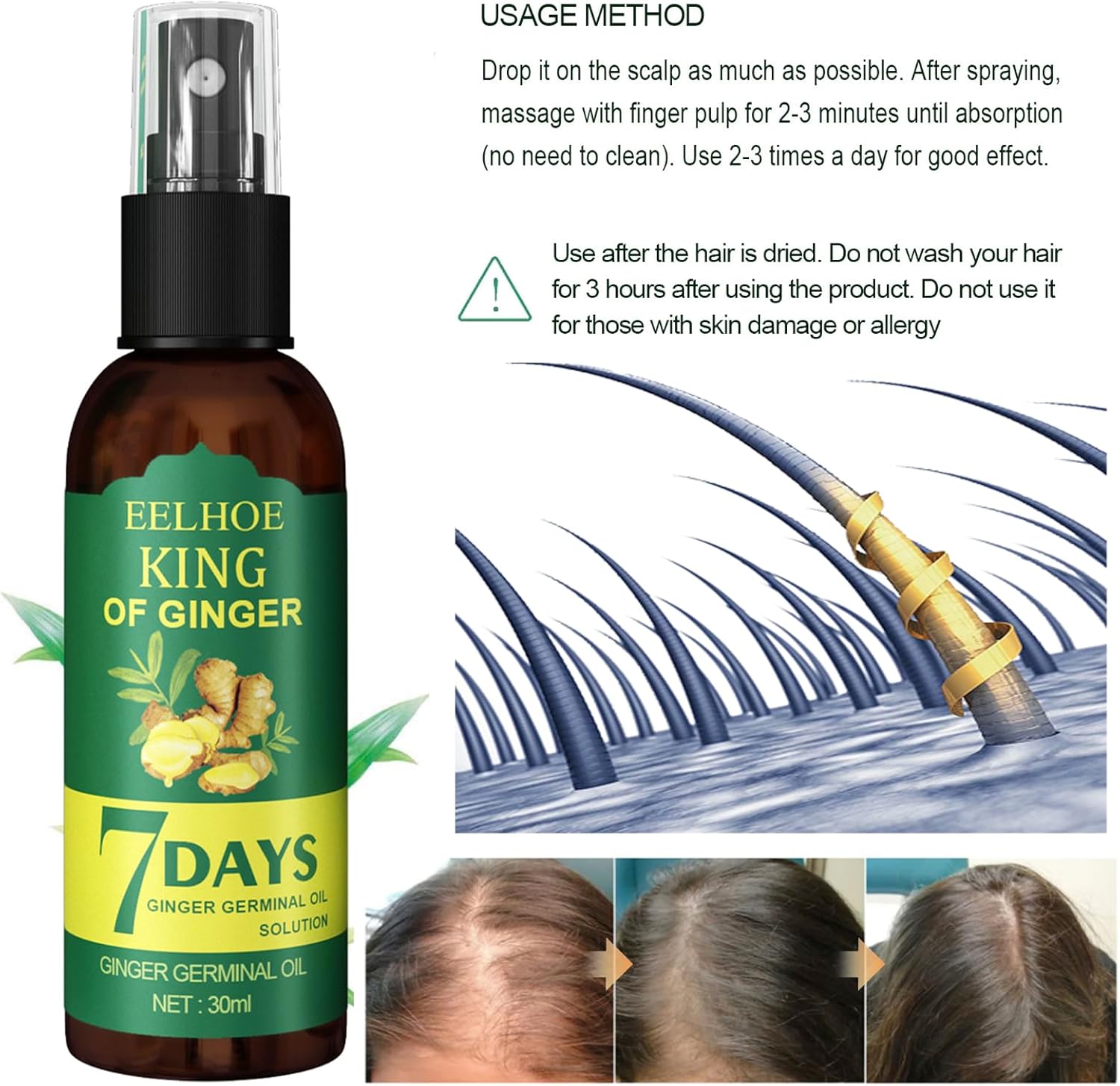 【Easy to Use】Spray Ginger Serum Spray evenly on scalp and hair, massage with fingers for 2-3 minutes until absorbed. Use 1-2 times a day to make your hair perfect every day.