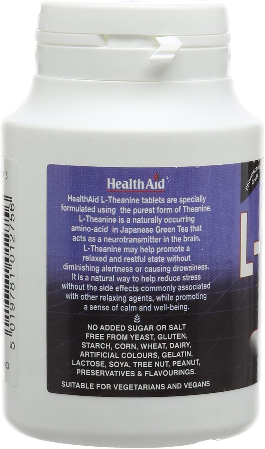 Many experience stress, anxiety, poor concentration and difficulty sleeping as a result of their busy day to day lives. L-Theanine is an amino-acid naturally found in green tea which has many benefits including antioxidant effects, immune and cardiovascular support, but it is primarily used to promote a positive and relaxed mental state. L-Theanine helps to calm and focus the mind, reducing anxiety and increasing alertness without causing drowsiness or any of the associated negative effects that caffeine can produce. It works by stimulating the production of alpha brain waves and impacting on the activity of key neurotransmitters such as dopamine and serotonin, inducing a state of deep relaxation and mental alertness. Some may find that it enables a reduction in the consumption of caffeinated drinks such as tea or coffee, as the desire for a “pick-me-up” diminishes. During the day L-Theanine can increase concentration, induce a state of calm alertness and relieve the tensions and anxieties of the day. At night it can help to relax the mind and enable it to switch-off for a more restful sleep. HealthAid L-Theanine 200mg tablets are specially formulated using the purest form of L-Theanine to provide perfect support for those with hectic lifestyles.