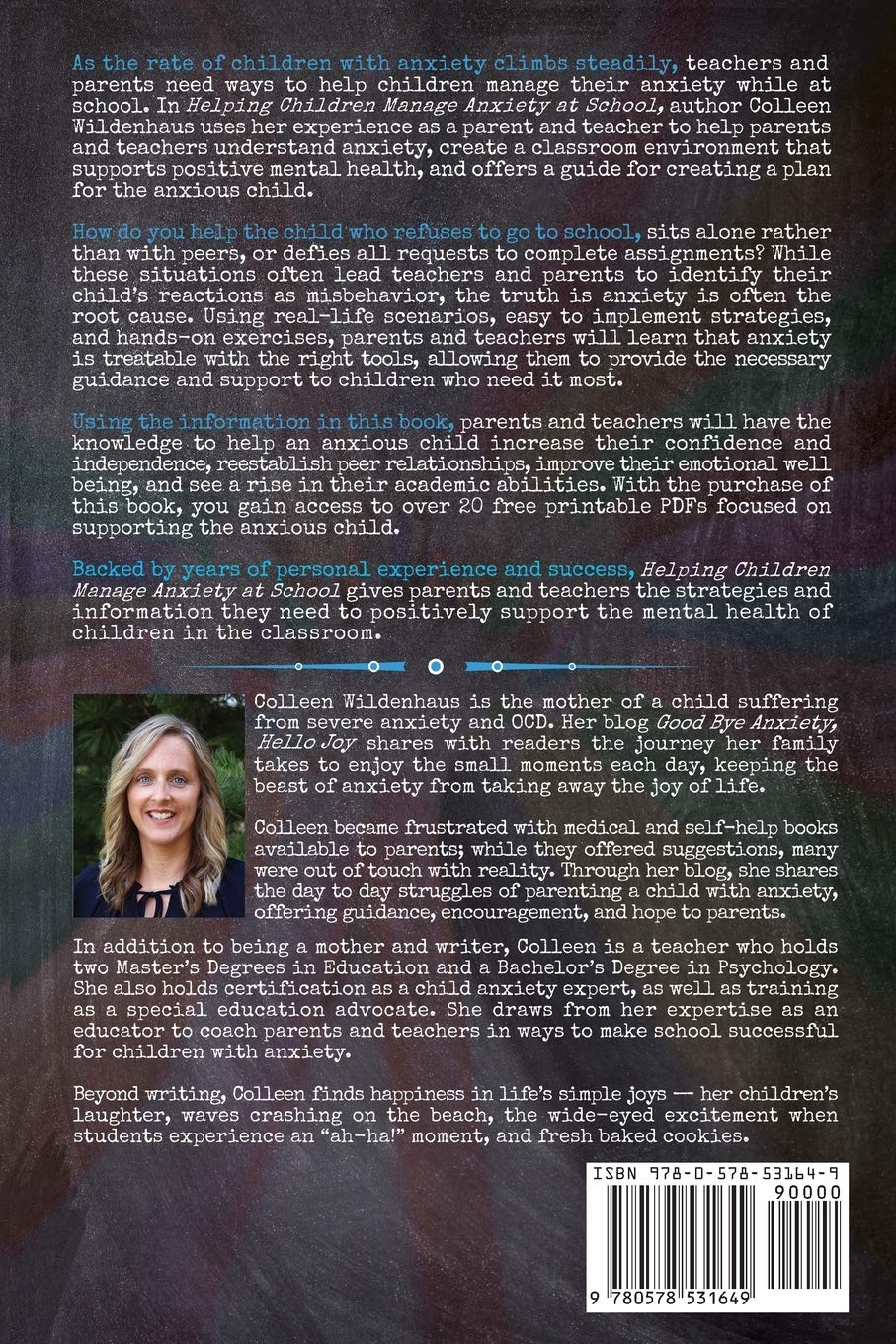 As the rate of children with anxiety climbs steadily, teachers and parents need ways to help children manage their anxiety while at school. In Helping Children Manage Anxiety at School, author Colleen Wildenhaus uses her experience as a parent and teacher to help parents and teachers understand anxiety, create a classroom environment that supports positive mental health, and offers a guide for creating a plan for the anxious child. How do you help the child who refuses to go to school, sits alone rather than with peers, or defies all requests to complete assignments? While these situations often lead teachers and parents to identify their child’s reactions as misbehavior, the truth is anxiety is often the root cause. Using real-life scenarios, easy to implement strategies, and hands-on exercises, parents and teachers will learn that anxiety is treatable with the right tools, allowing them to provide the necessary guidance and support to children who need it most. Using the information in this book, parents and teachers will have the knowledge to help an anxious child increase their confidence and independence, reestablish peer relationships, improve their emotional well being, and see a rise in their academic abilities. With the purchase of this book, you gain access to over 20 free printable PDFs focused on supporting the anxious child. Backed by years of personal experience and success, Helping Children Manage Anxiety at School gives parents and teachers the strategies and information they need to positively support the mental health of children in the classroom.