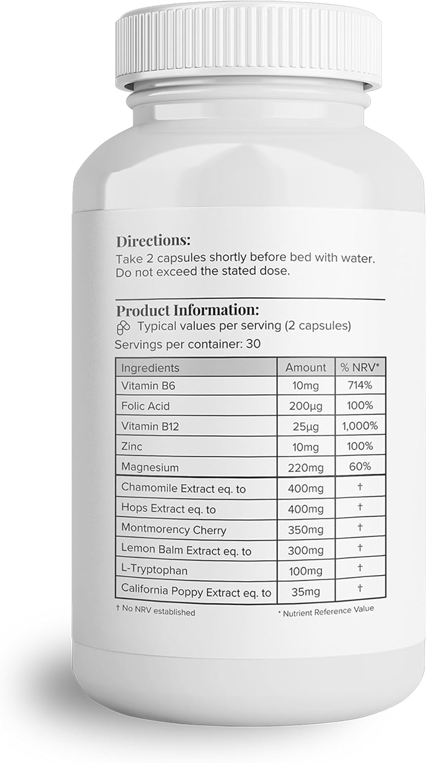 Our Night Time Complex contains a super blend of natural ingredients, including L-Tryptophan, Montmorency Cherry, Hops Extract, Lemon Balm, Magnesium, B vitamins, Folic Acid, Zinc, Chamomile Extract, and California Poppy Extract. Our unique formula delivers potent doses of effective ingredients to promote more restful sleep and calmness.