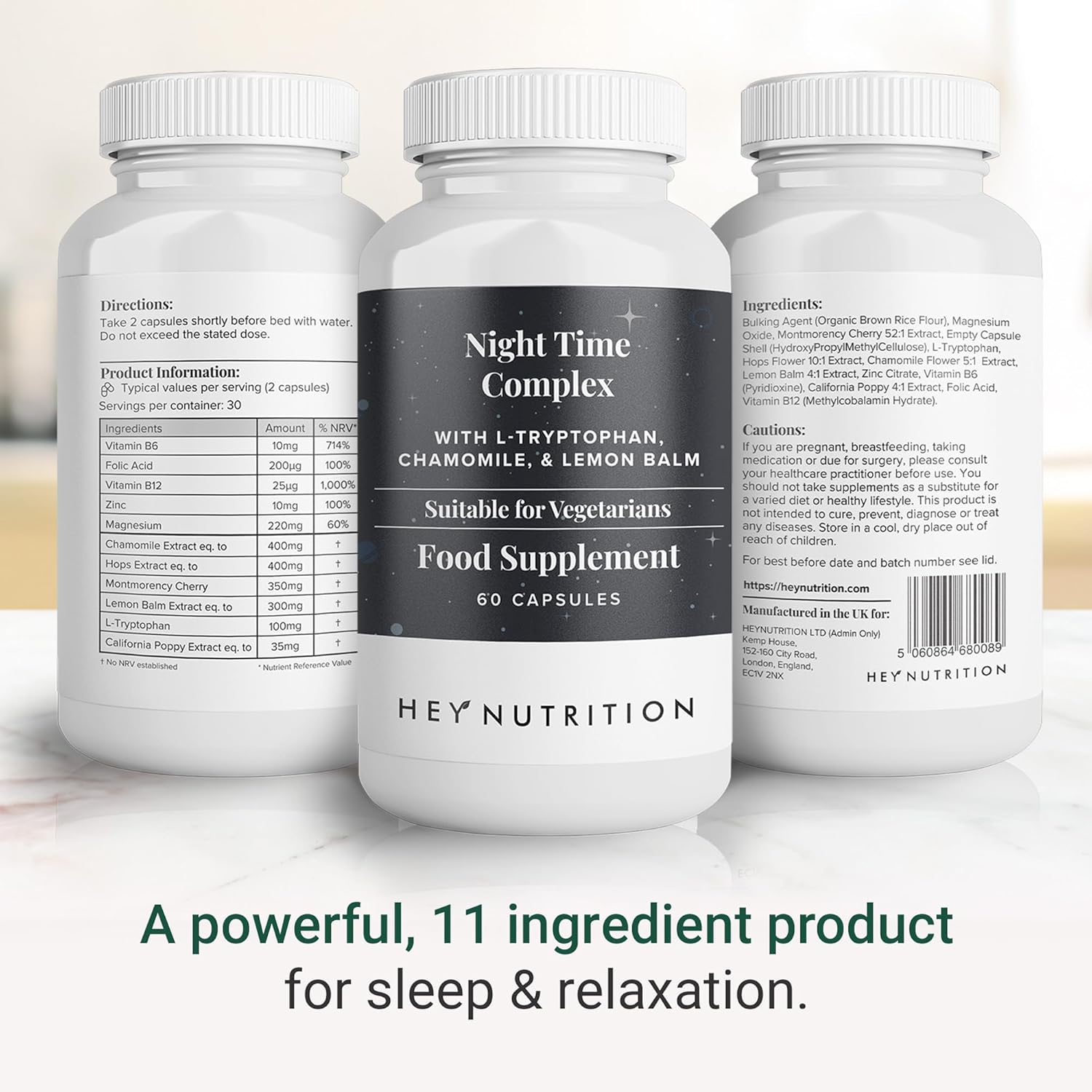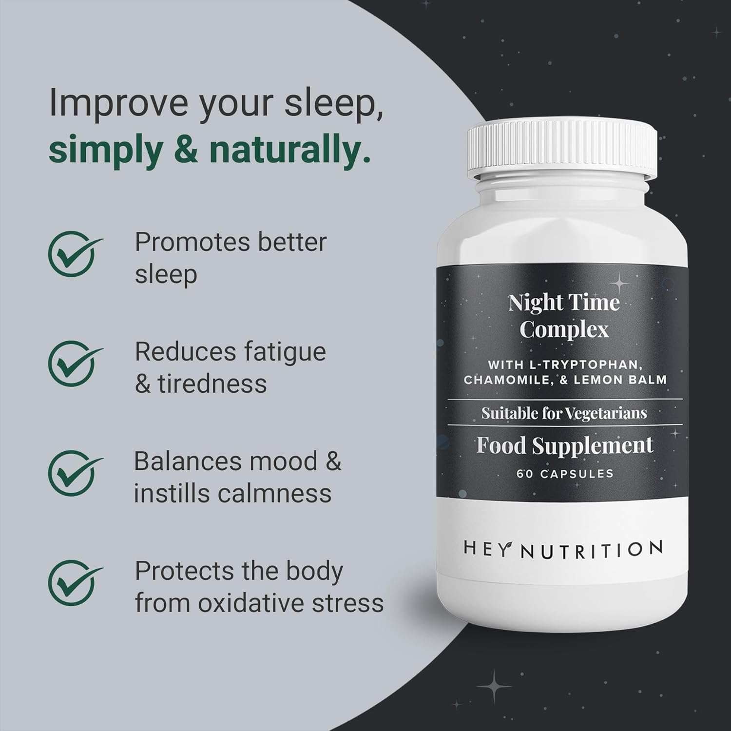 Hey Nutrition Night Time Complex with 100mg L-Tryptophan, Chamomile & Lemon Balm Natural Supplement for Sleep & Relaxation – Non-GMO, 60 Vegetarian Capsules