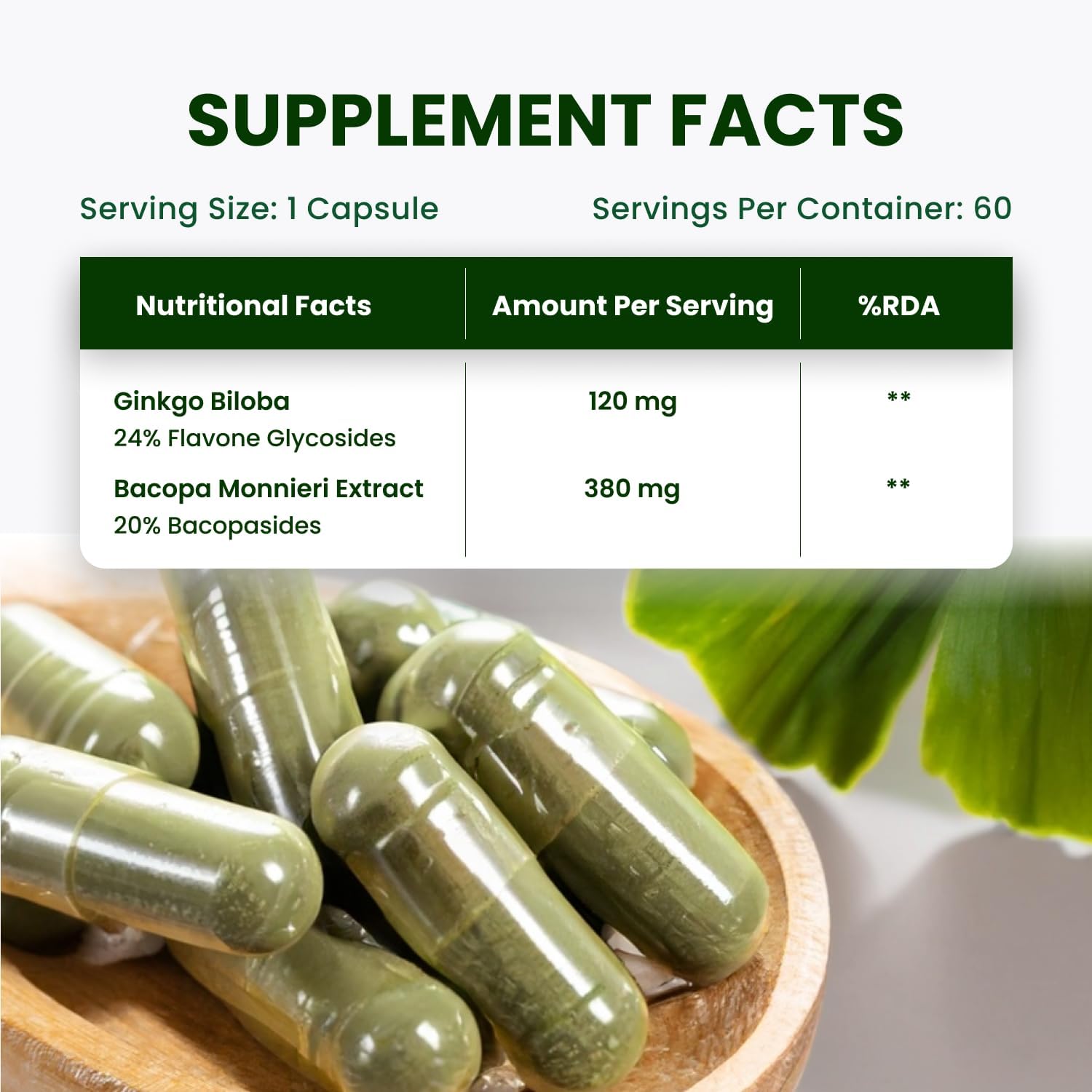 Himalayan Organics Ginkgo Biloba 500mg with Brahmi for Better Concentration, Memory & Learning | Helps Anxiety & Stress | Healthy Blood Circulation – 60 Veg Capsules