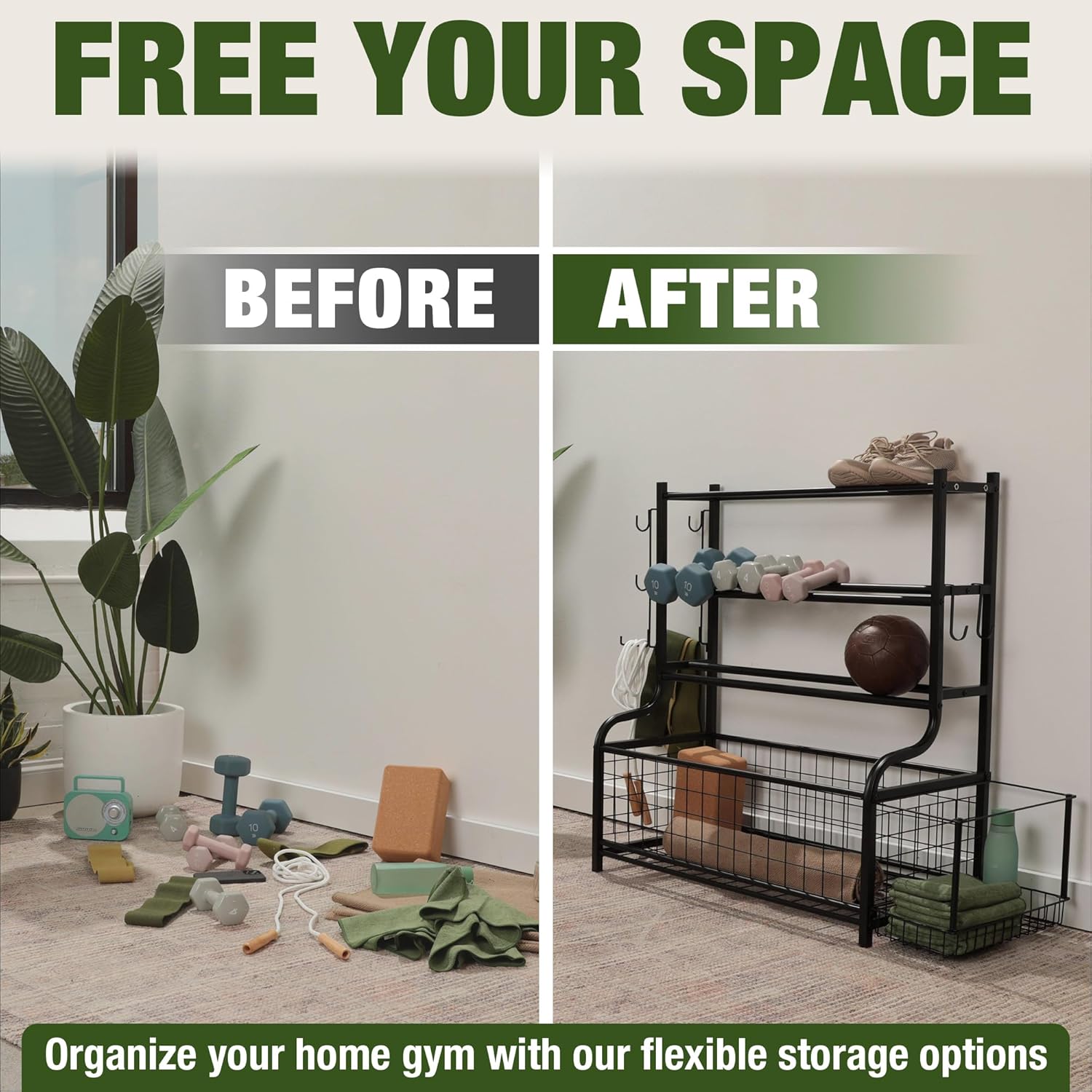 The Clutter-Clearing Gym Upgrade. Usher space-freeing storage into your home gym! With a Homestead weight holder, you get it all. Racks for your dumbbells & kettlebells. Hooks for bands & ab rollers. And baskets for your yoga mat, foam rollers, and more.