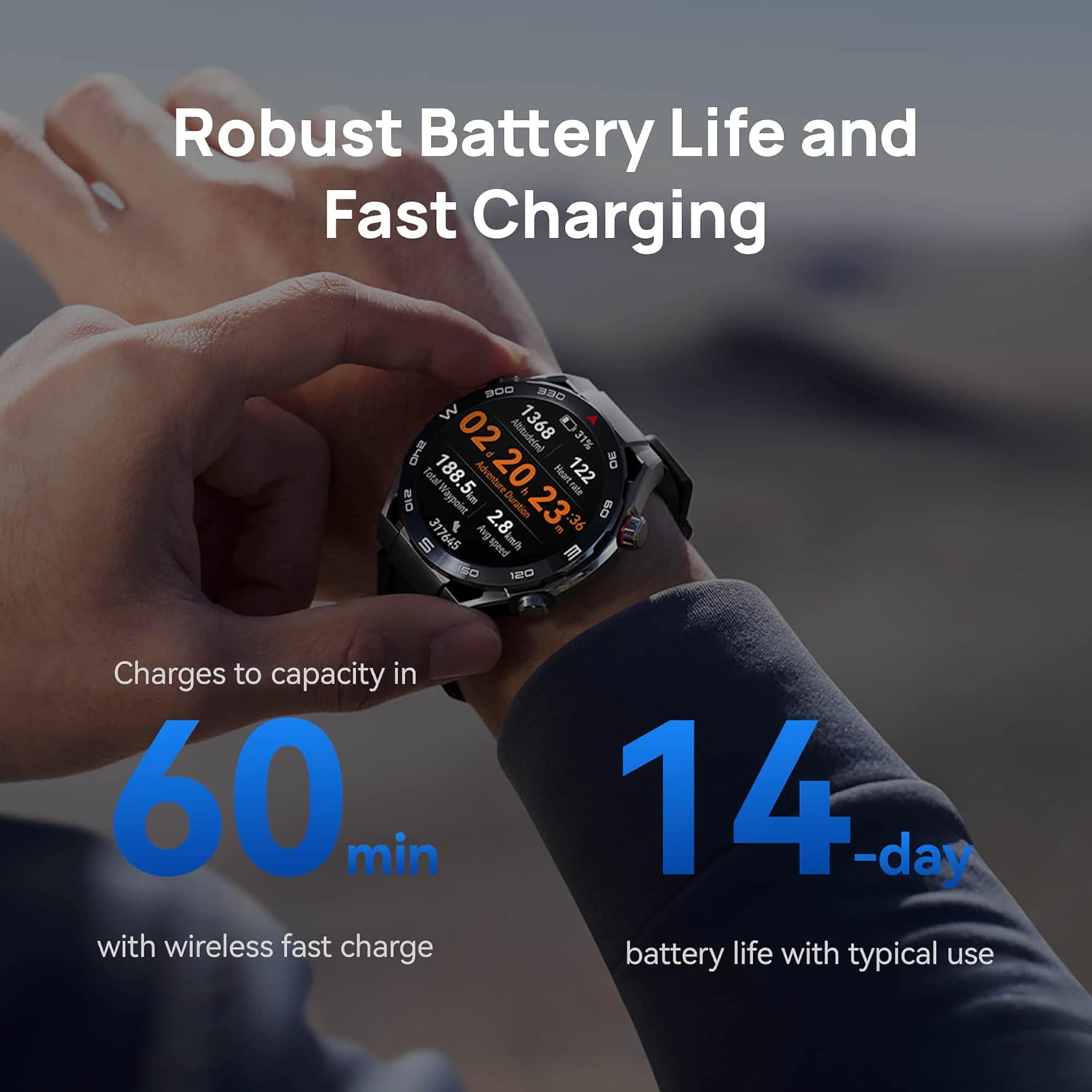 LONG BATTERY LIFE. Up to 14-day battery life with typical use and 8-day battery life with heavy use to experience more with your smartwatch. Fully charge in 60 mins with wireless fast charger