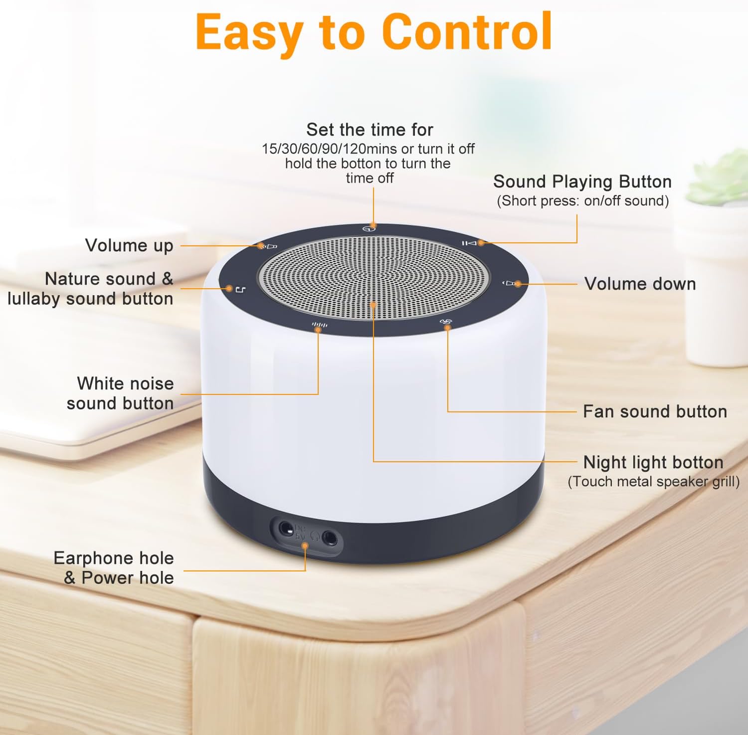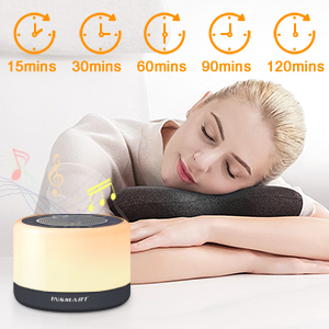 The white noise machine features 5 timer options: 15/30/60/90/120 mins. You can choose to play the sounds continuously or choose from the auto off Timer.