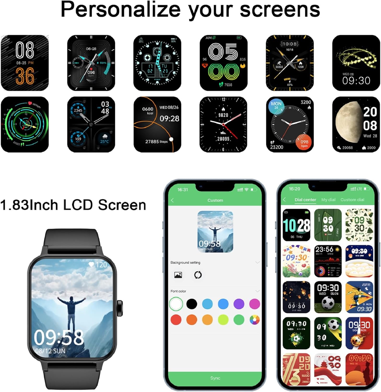 ⌚【 1.8″ HD Touch Screen and 150+ Custom Dials 】Smart Watch with 1.8 inches HD full touch colorful screen and 4 levels adjustable brightness, brings you a great visual/touch experience at any time. Also you could choose 150+ online fantastic/cool dials or set favourite photos as DIY Dial on “GloryFit” APP, keep in fashion and unique