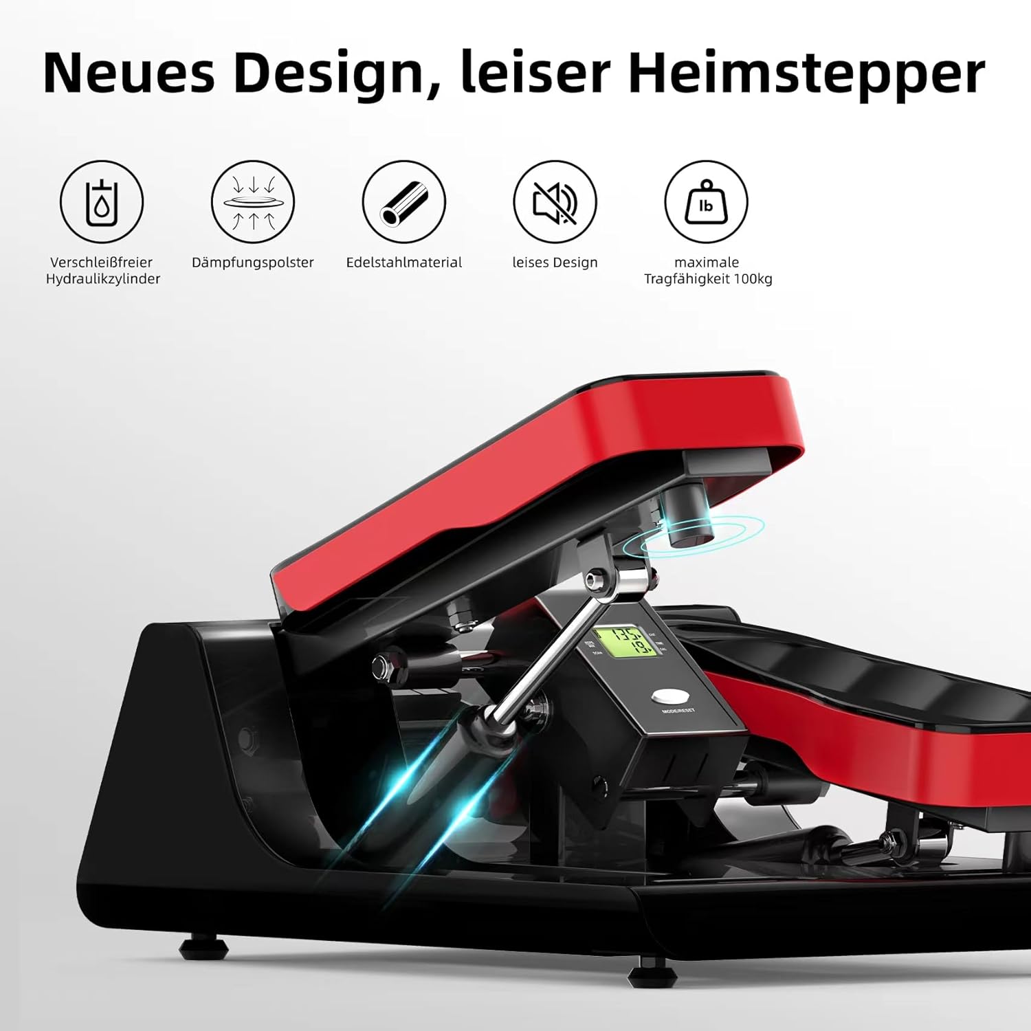 The main structure of the entire device is made of 1.8 mm thick steel tube, combined with a full hydraulic balance rod made of stainless steel, which is wear-free. This construction is strong, durable and offers a stable balance as well as high resistance. In addition, a noise-absorbing cushioning pad is attached to the bottom of the pedal, so that training can be carried out quietly and without interference.Note: The damper and the hydraulic cylinder heat up due to friction during movement and must not be used continuously for longer than 20 minutes.