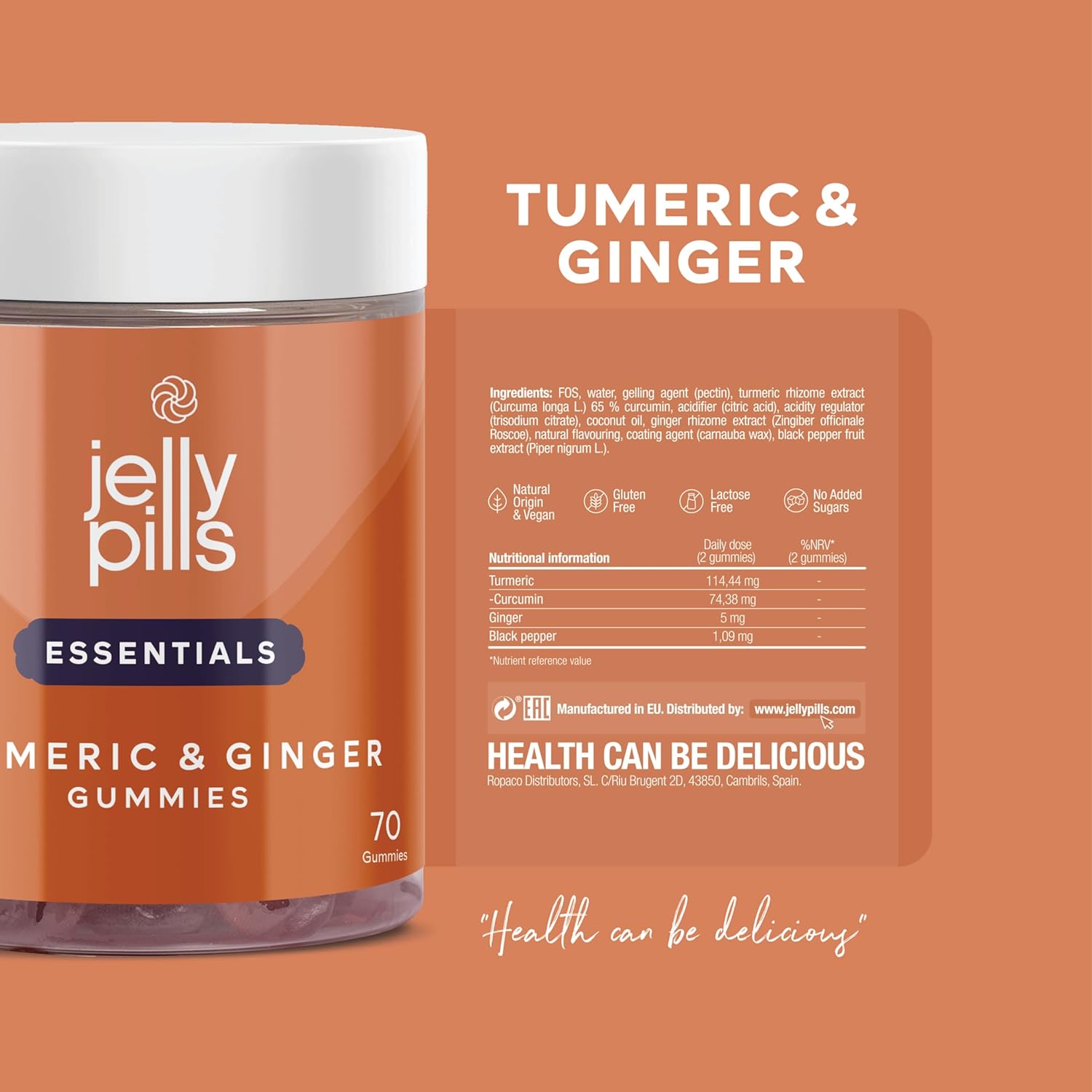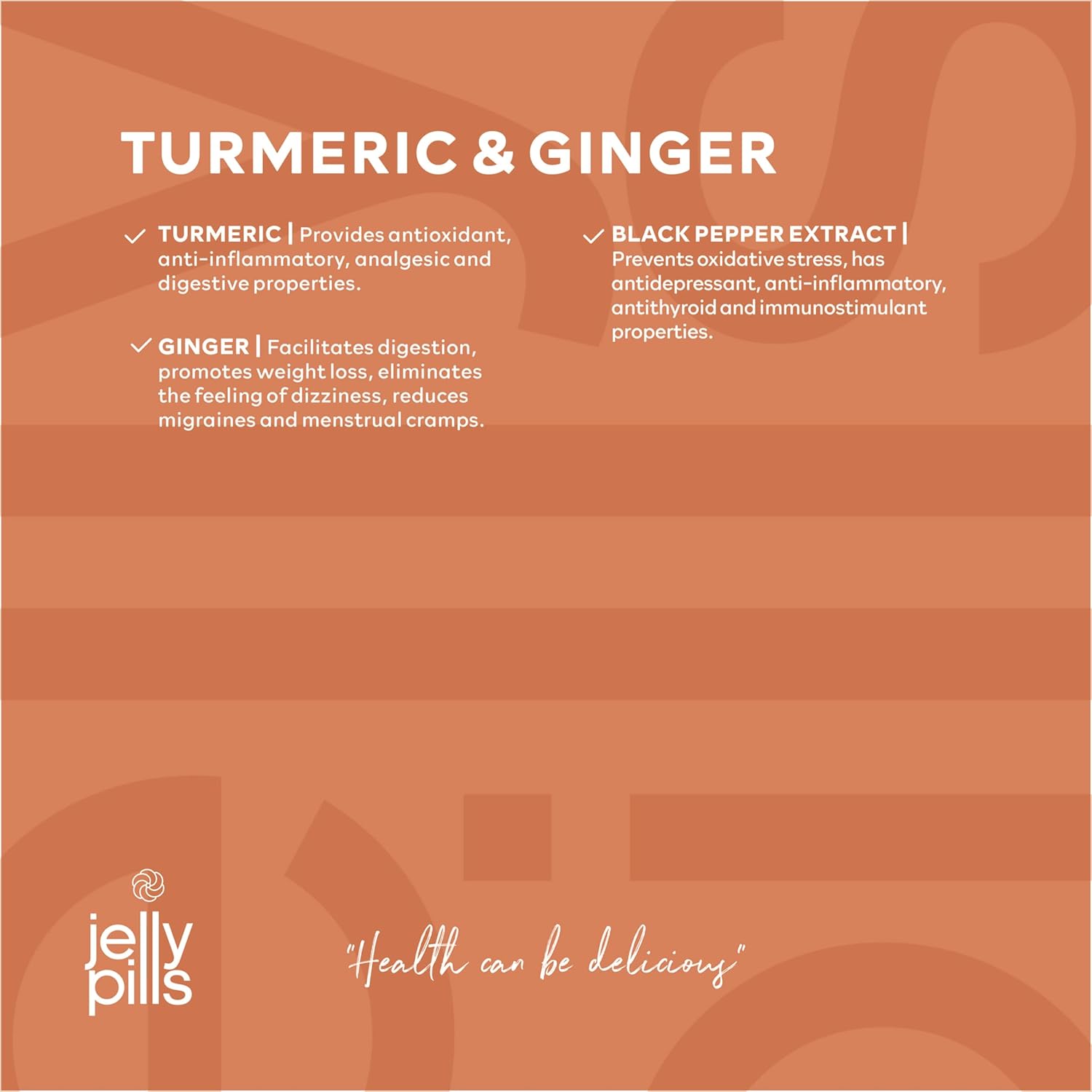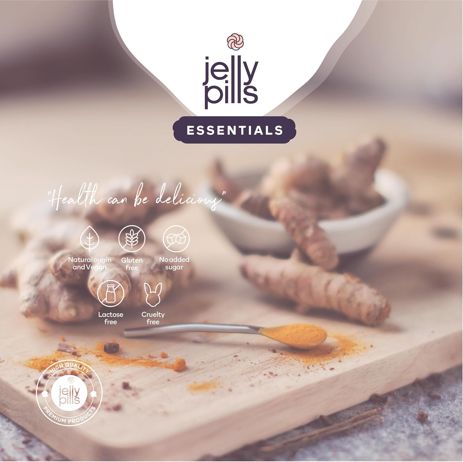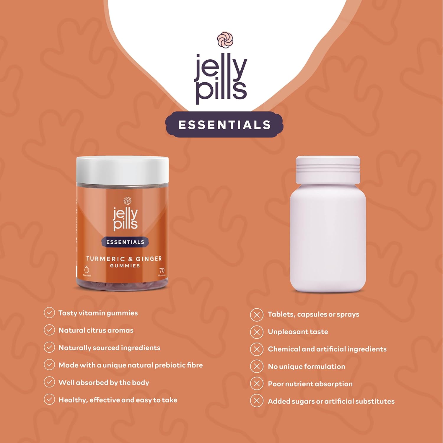 Jelly Pills® Turmeric Gummies with Ginger & Black Pepper – 70 Vegan Orange Flavoured Gummies – No Added Sugars – Curcumin Extract – Anti-Inflammation and Digestive Problems