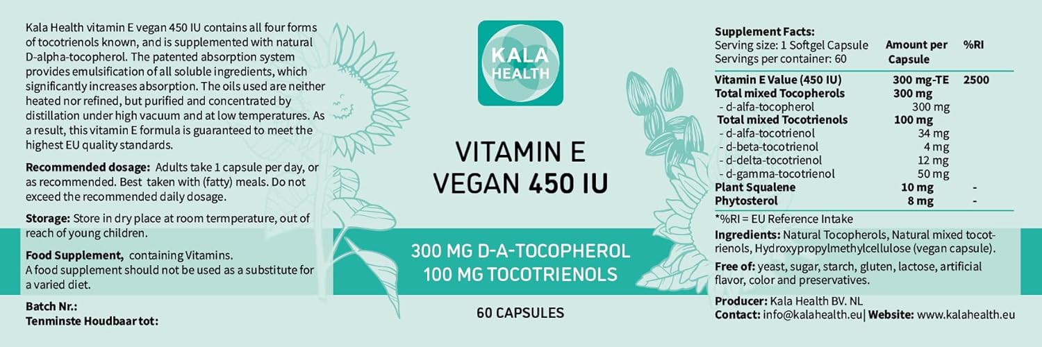 Kala Health Vitamin E 450 IU 400mg Tocopherol + Tocotrienol Vitamin E Vegan – Alpha Tocopherol + All 4 Tocotrienols – Alpha Tocotrienol + Beta Tocotrienol + Delta Tocotrienol and Gamma Tocotrienol