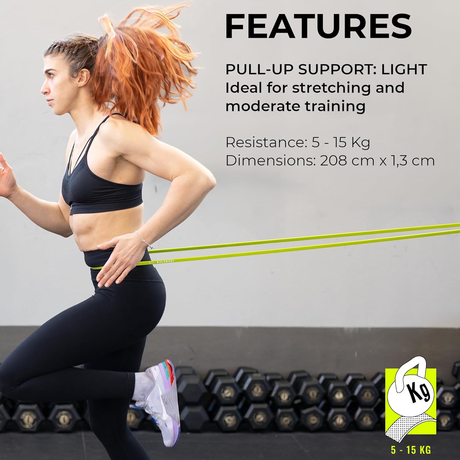 🟡 DIFFERENT RESISTANCE LEVELS ACCORDING TO YOUR NEEDS: YELLOW COLOR, Ideal for stretching and moderate strength training. Light pull-up support.