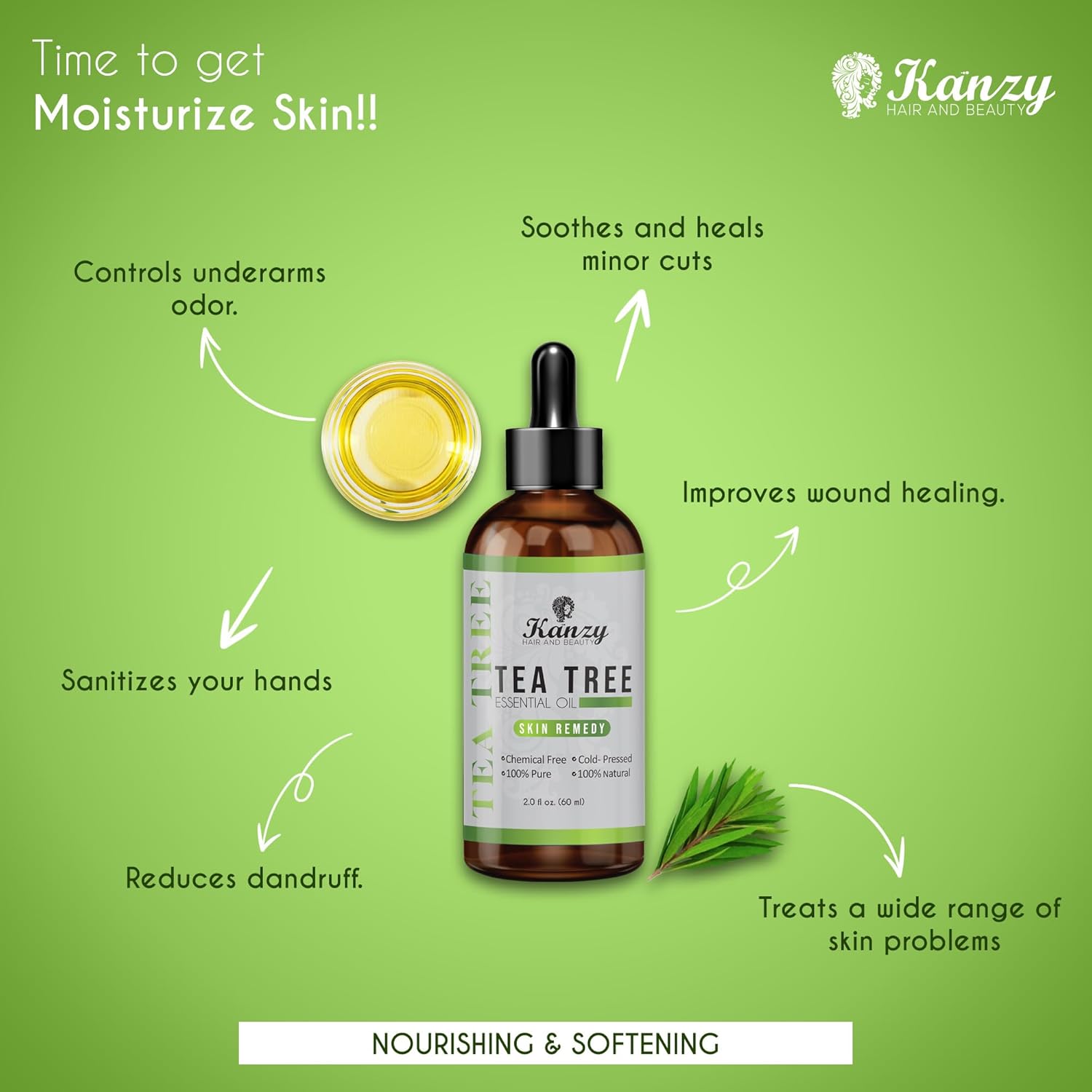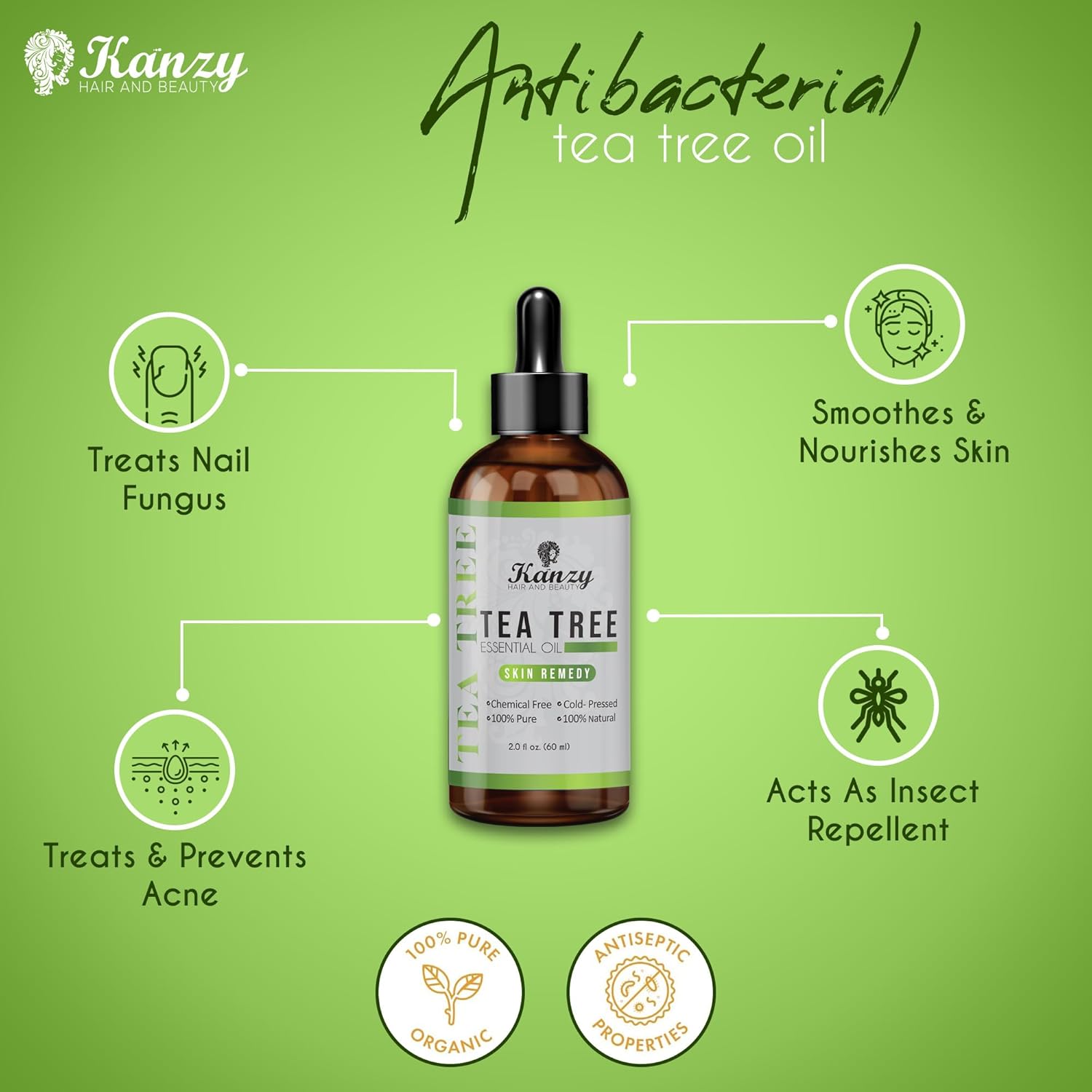 Kanzy Tea Tree Oil, Essential Oil, Skin Remedy 60ml – Treatment for Hair, Face & Nails Natural Vegan Organic Tea Tree Essential Oil