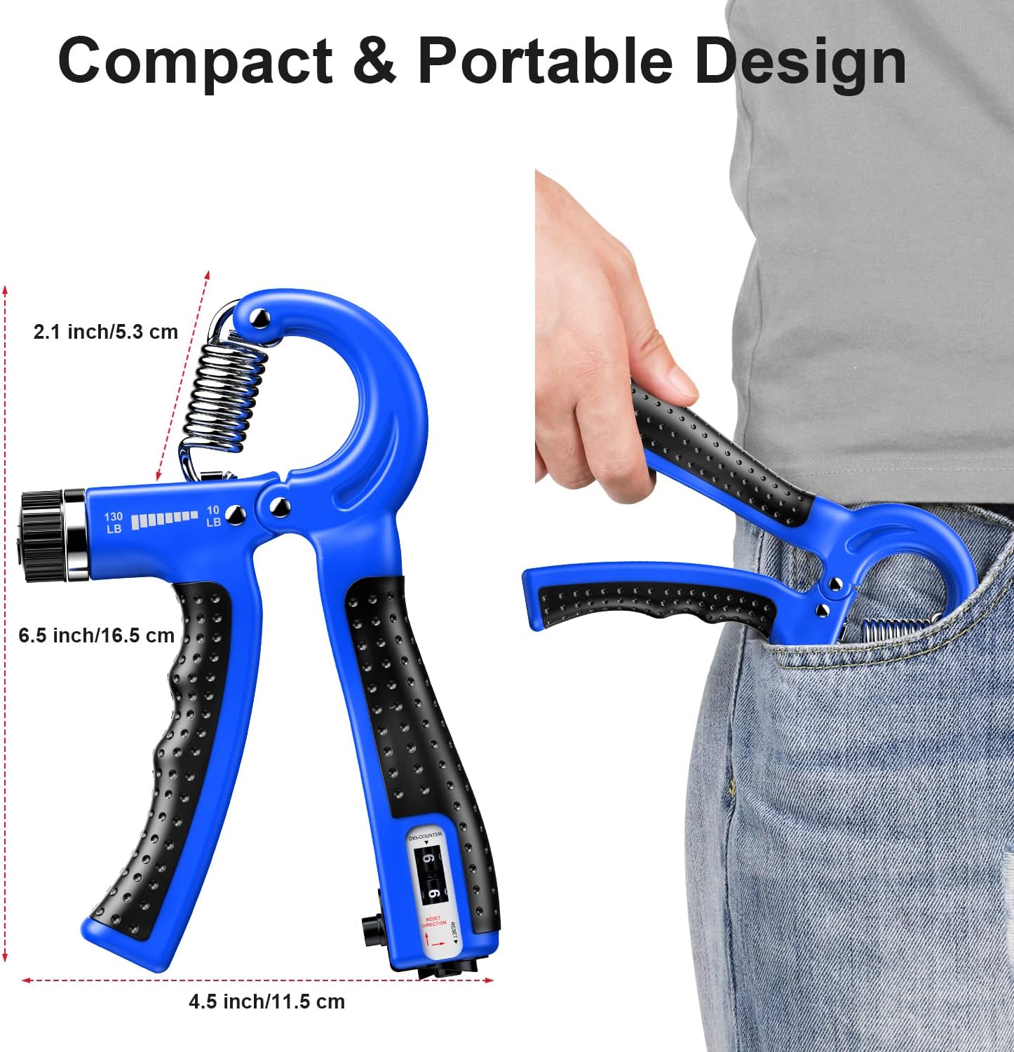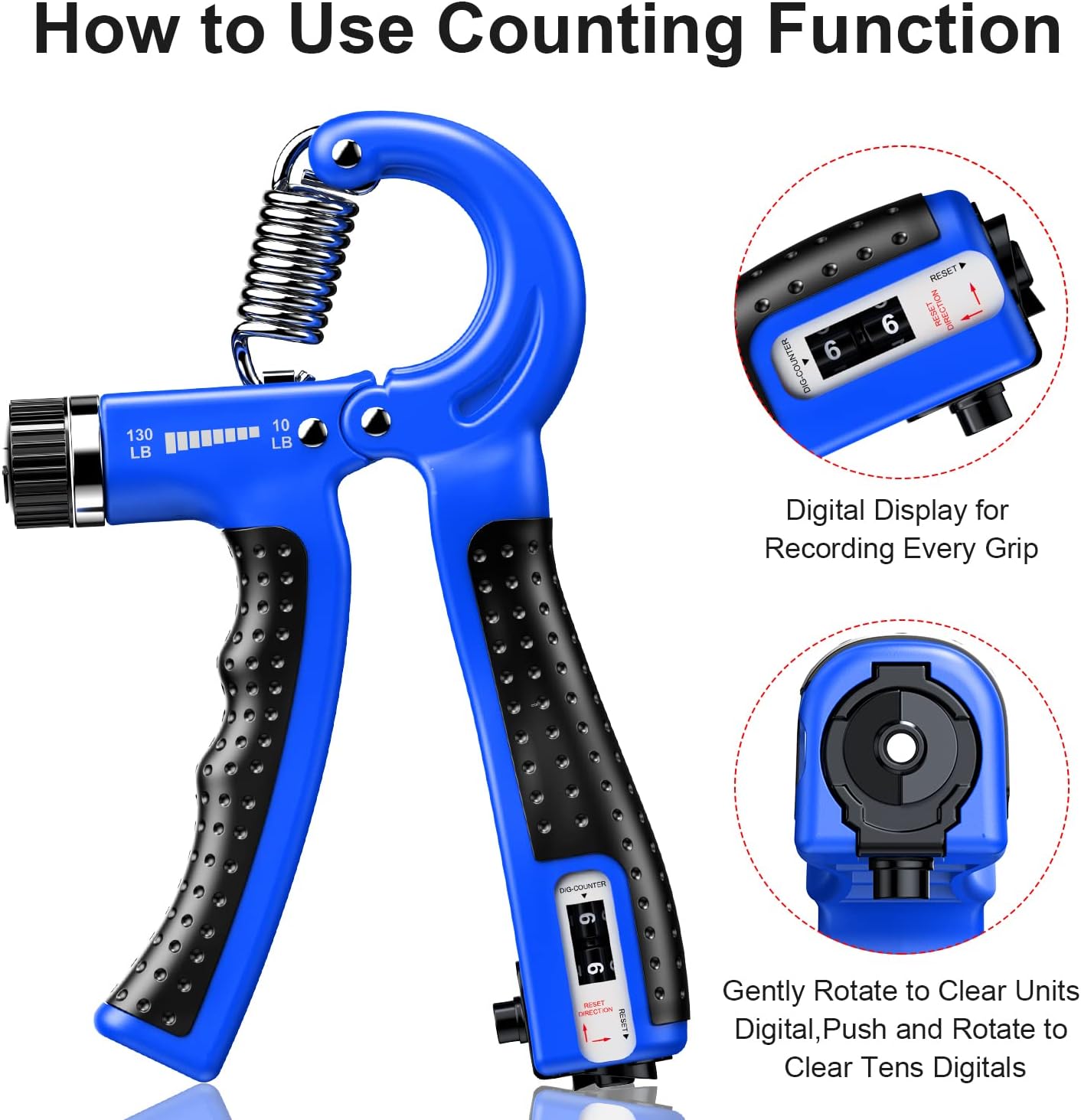 【Smart Counting Grip Strengthener】 Add counting function, our hand strengthener could record your exerciser number every time when you use it. So you can know better your training progress and training results with counting number. Just Press the button firmly to count automatically. Gently rotate button to clear units digital, push and rotate button to clear tens digitals.