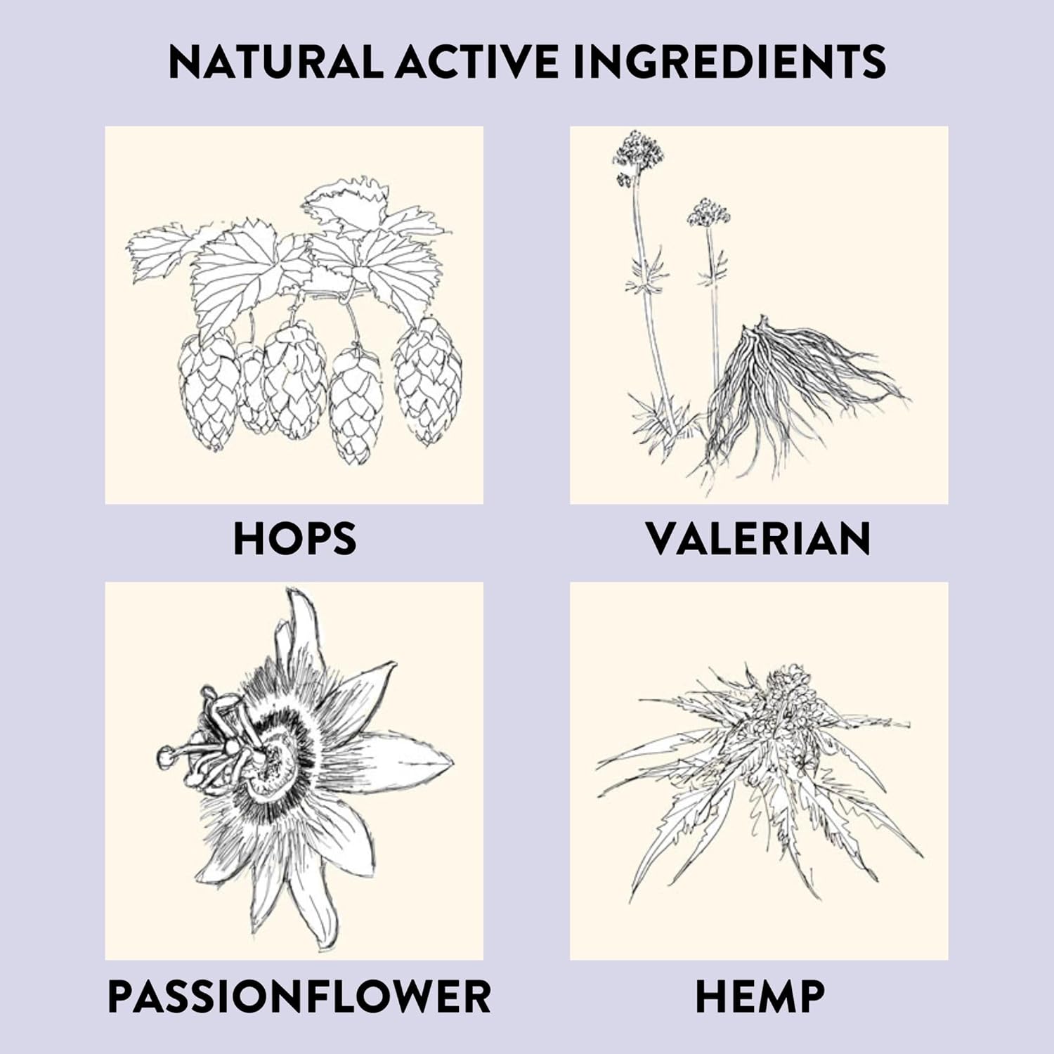 Contains Hemp Extract, Valerian, Passionflower and Hops