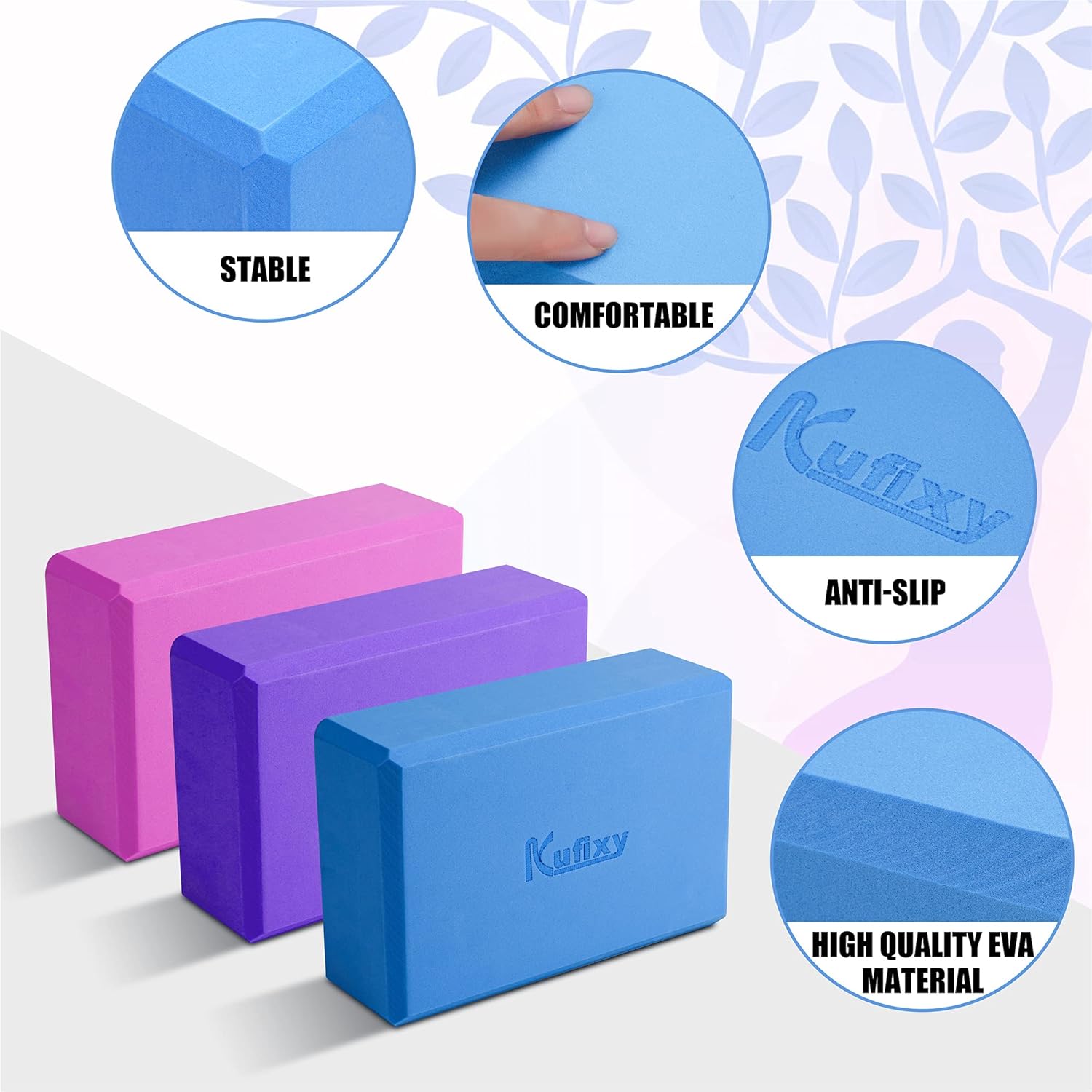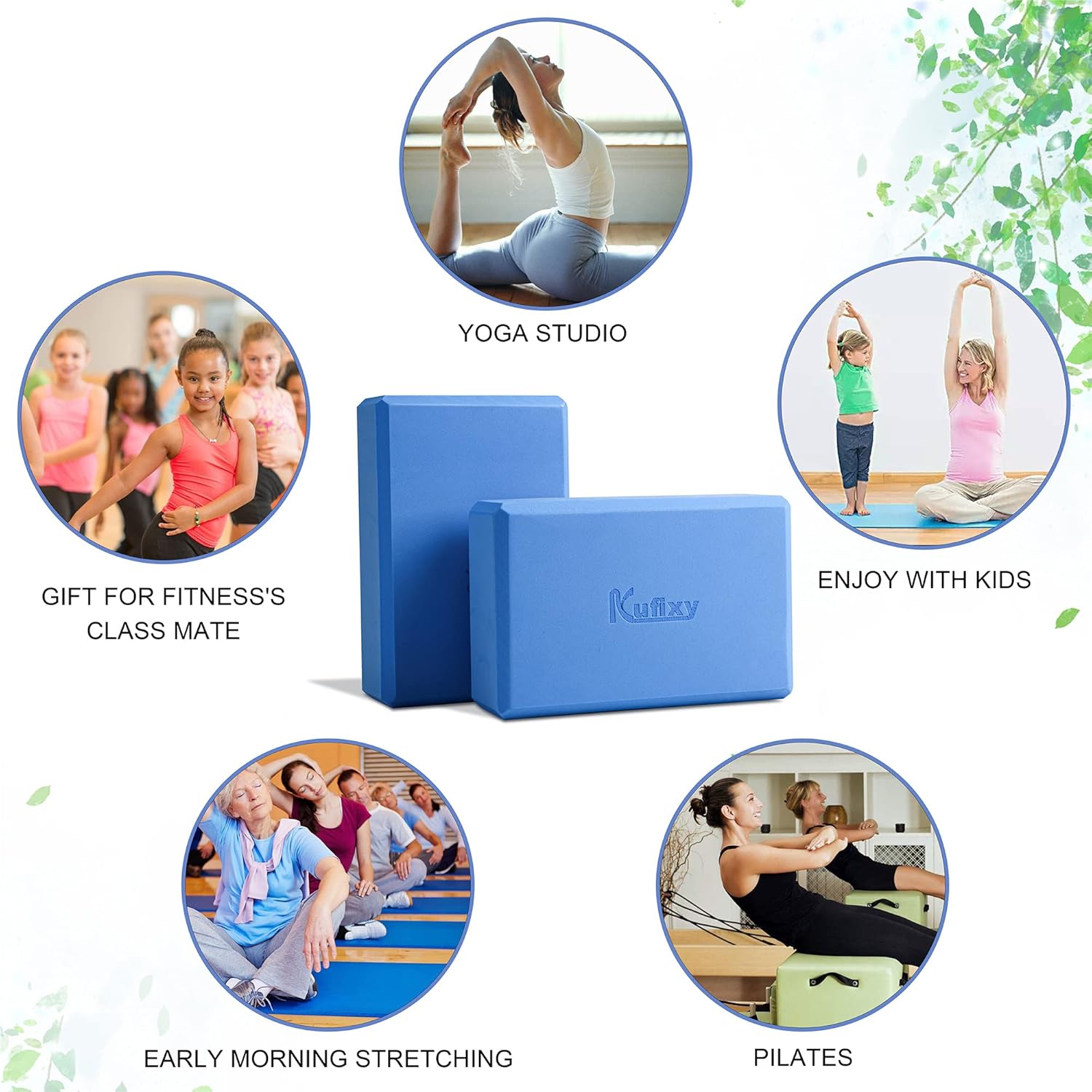 Kufixy Yoga Blocks Set of 2 with Strap EVA Foam Soft and Sturdy Non Slip Lightweight Yoga Brick for Balance Stretching Pilates Meditation and Deep Flexible Poses