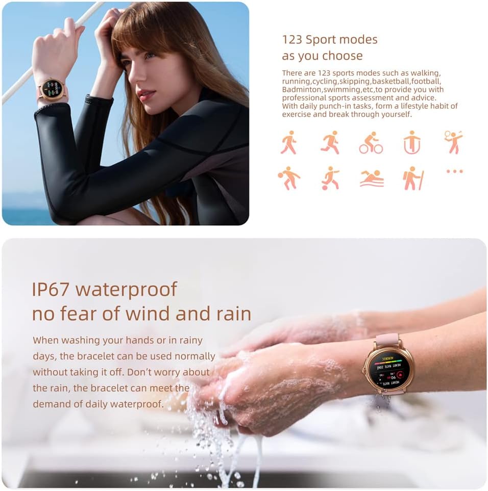 Golden Luster Watchcase: The figure of this womens smart watch adopts elegant and unique patterns, which adds a fashionable touch to any outfit. Smooth lines and exquisite crown design reflect female grace and tenderness. The silicone strap is not only comfortable to wear, but also not easy to wear or deform.