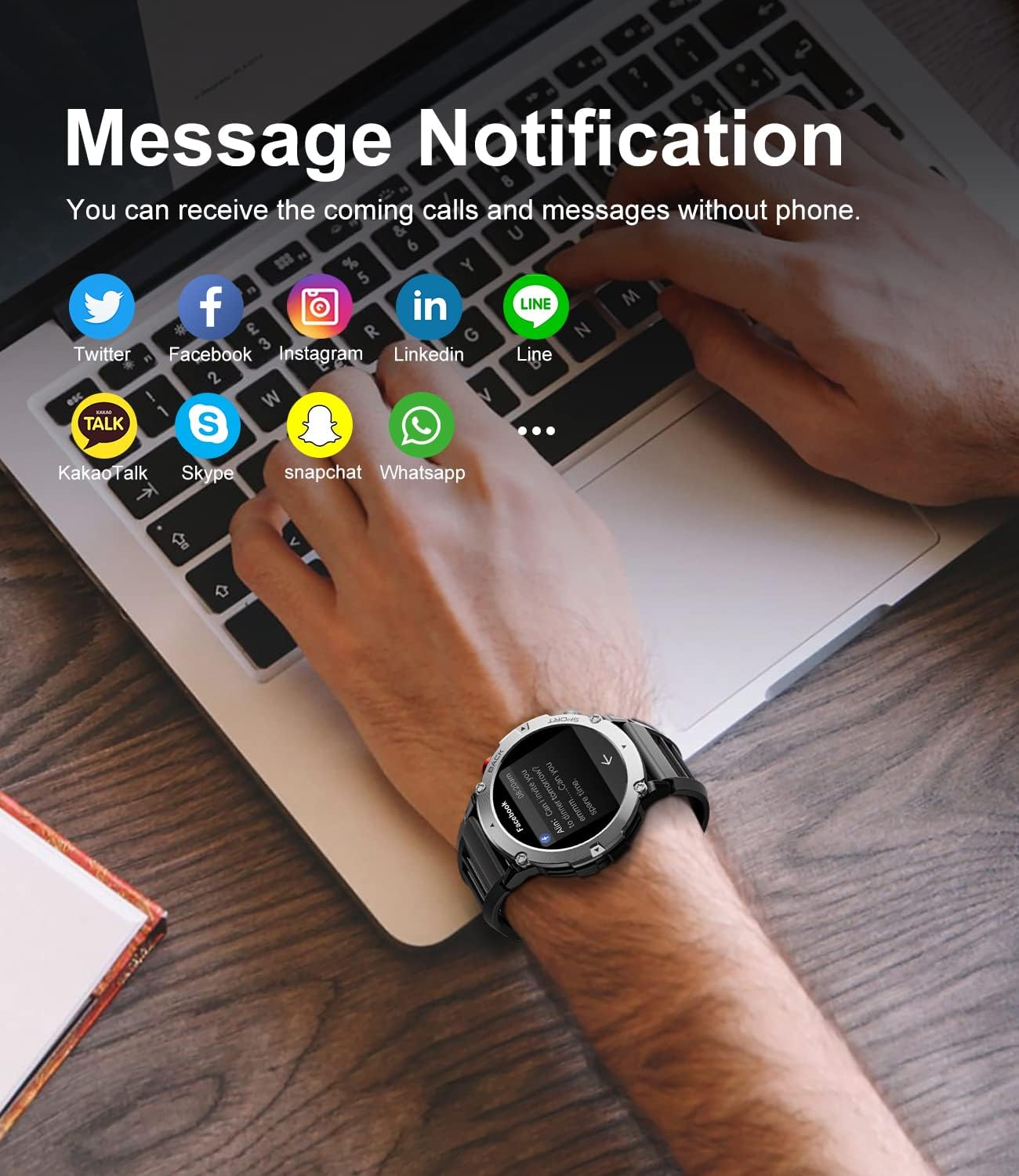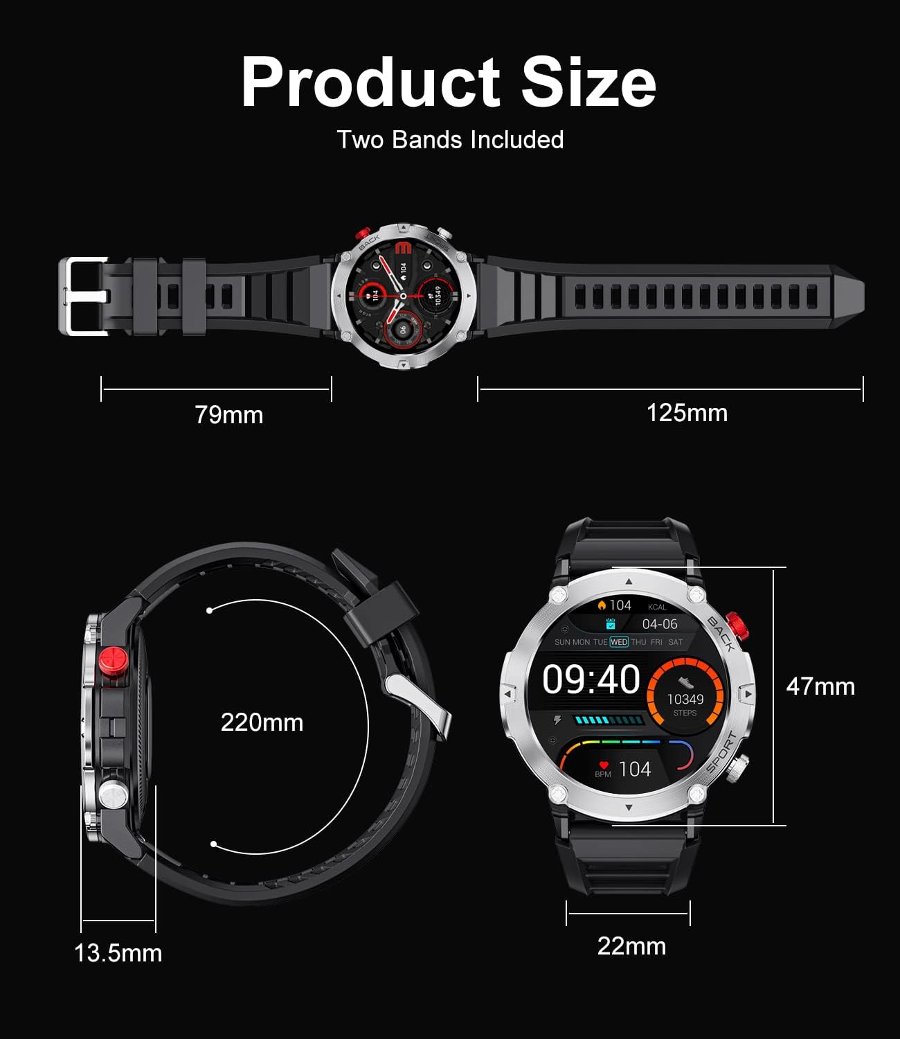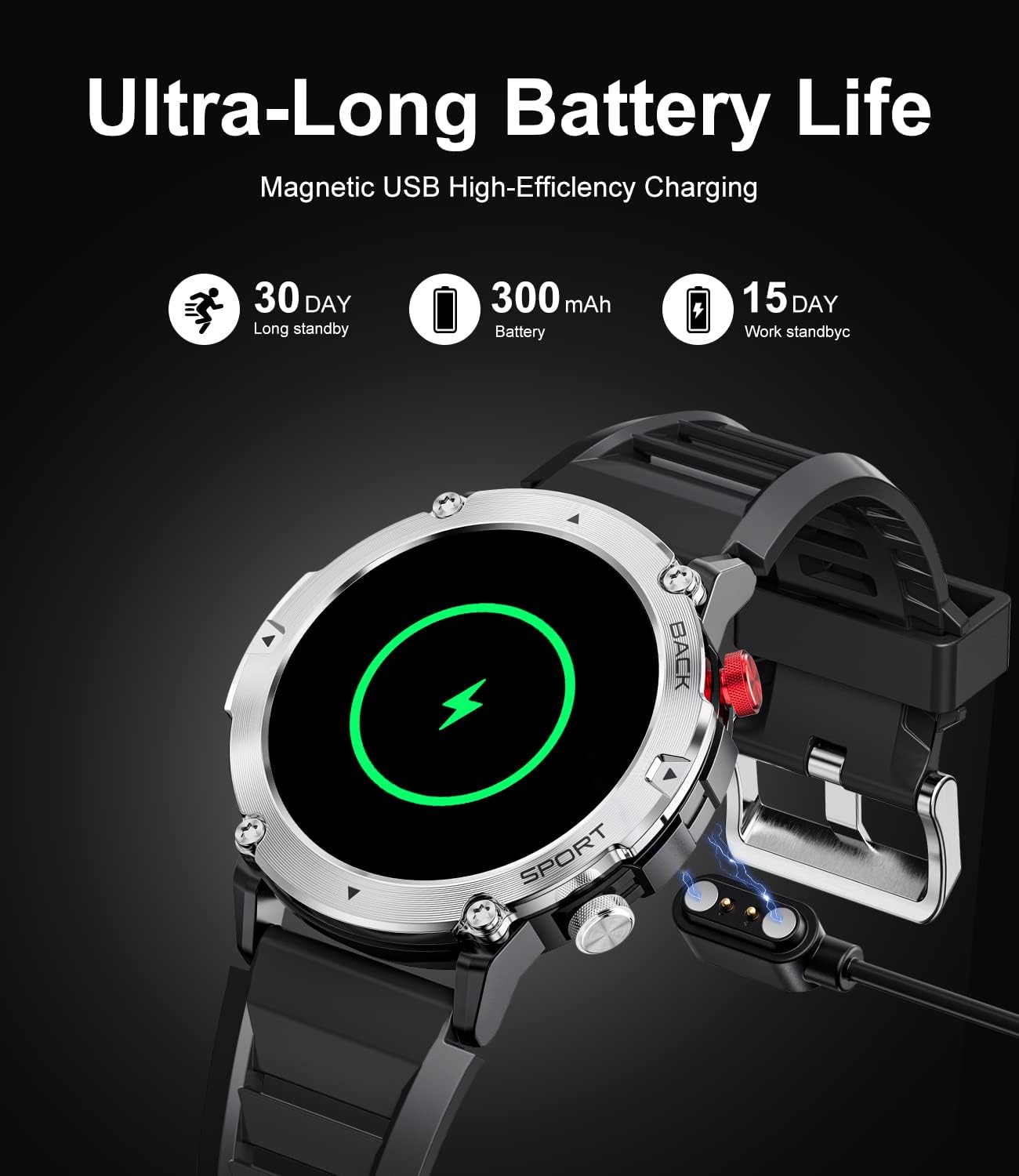 【Activity Tracker】 The military smart watch is your ultimate health and fitness companion. The built-in high-performance sensors continuously monitor your heart rate, blood pressure, blood oxygen and sleep 24 hours a day, providing comprehensive body data tracking, to help you better understand your physical condition. (Data is for reference only and not to be used as medical data)