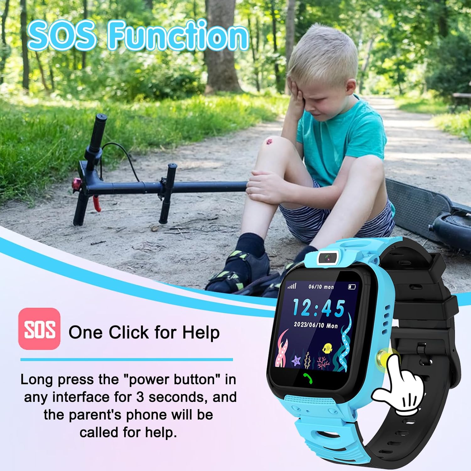 👍【Kids Smart Watch with Calling】: Insert a 2G SIM card to use the phone function of the kids smartwatch. 3 SOS emergency numbers and 10 phone numbers can be saved in the APP. You can call your kids at any time. When kids are in danger, long press the SOS button and the kids watch will dial 3 SOS numbers in turn, which is very useful for children in emergency situations.