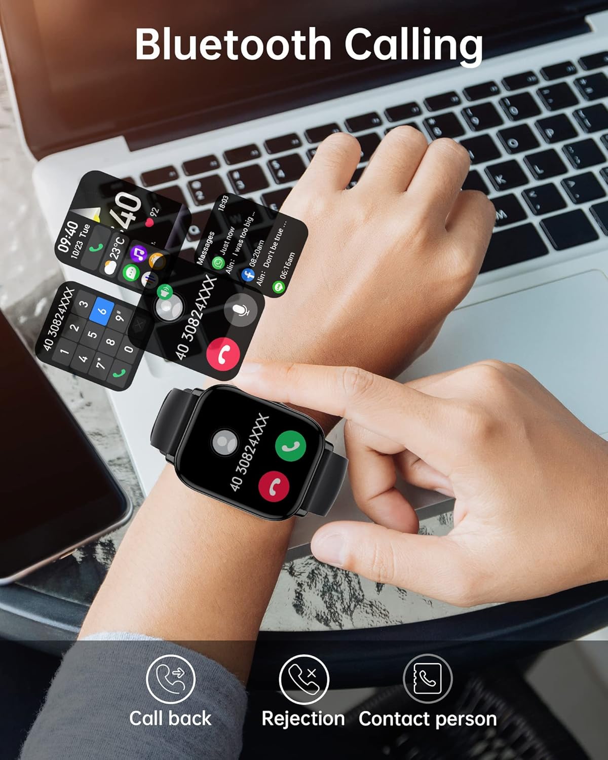 ✅【Smart Watch with Bluetooth Call Function】: The smartwatch are equipped with high-quality built-in speakers, allowing you to answer/make calls. When your phone receives a call or SMS (such as WhatsApp, Facebook, Twitter, Instagram, Skype, Line, etc.), you will be reminded. There are also practical functions such as music control, weather forecast, sedentary reminders, remote camera control, alarm clock, stopwatch, etc.