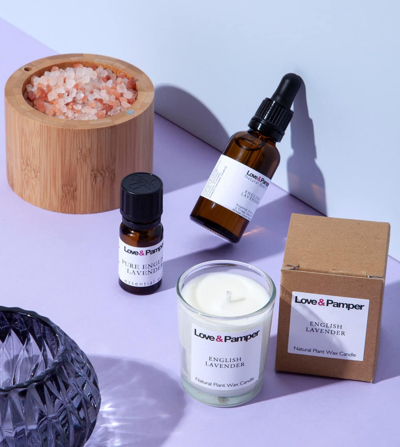 Love & Pamper Sleep Well Original Pamper Gifts for Women, Relaxation Spa Set, Lavender Essential Massage Oil, Himalayan Bath Salt, Candle and Soap, Memorable Gift of Aromatherapy