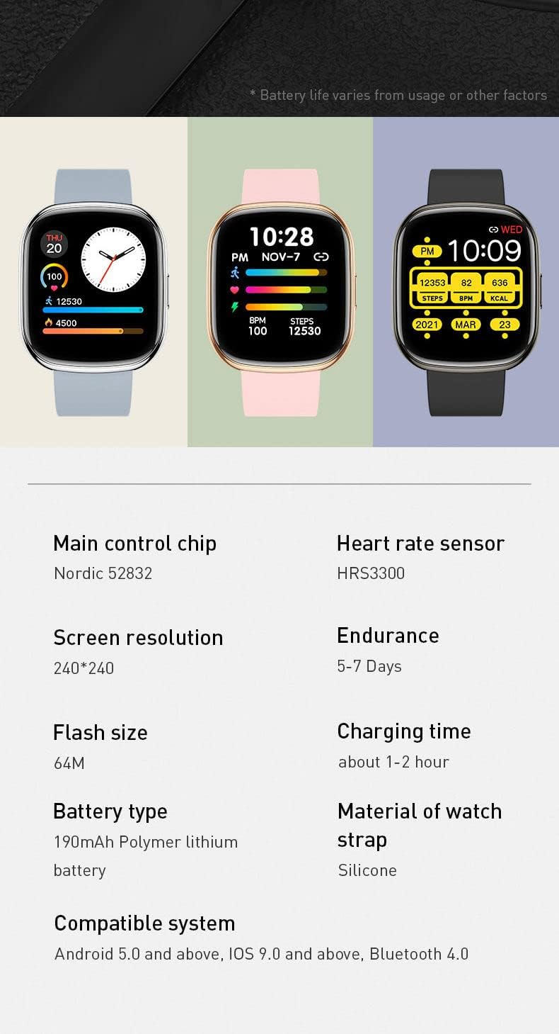 {Package Content}: Smartwatch +Silicone wristband + silicone Fob Strap + Charger + instuction manual