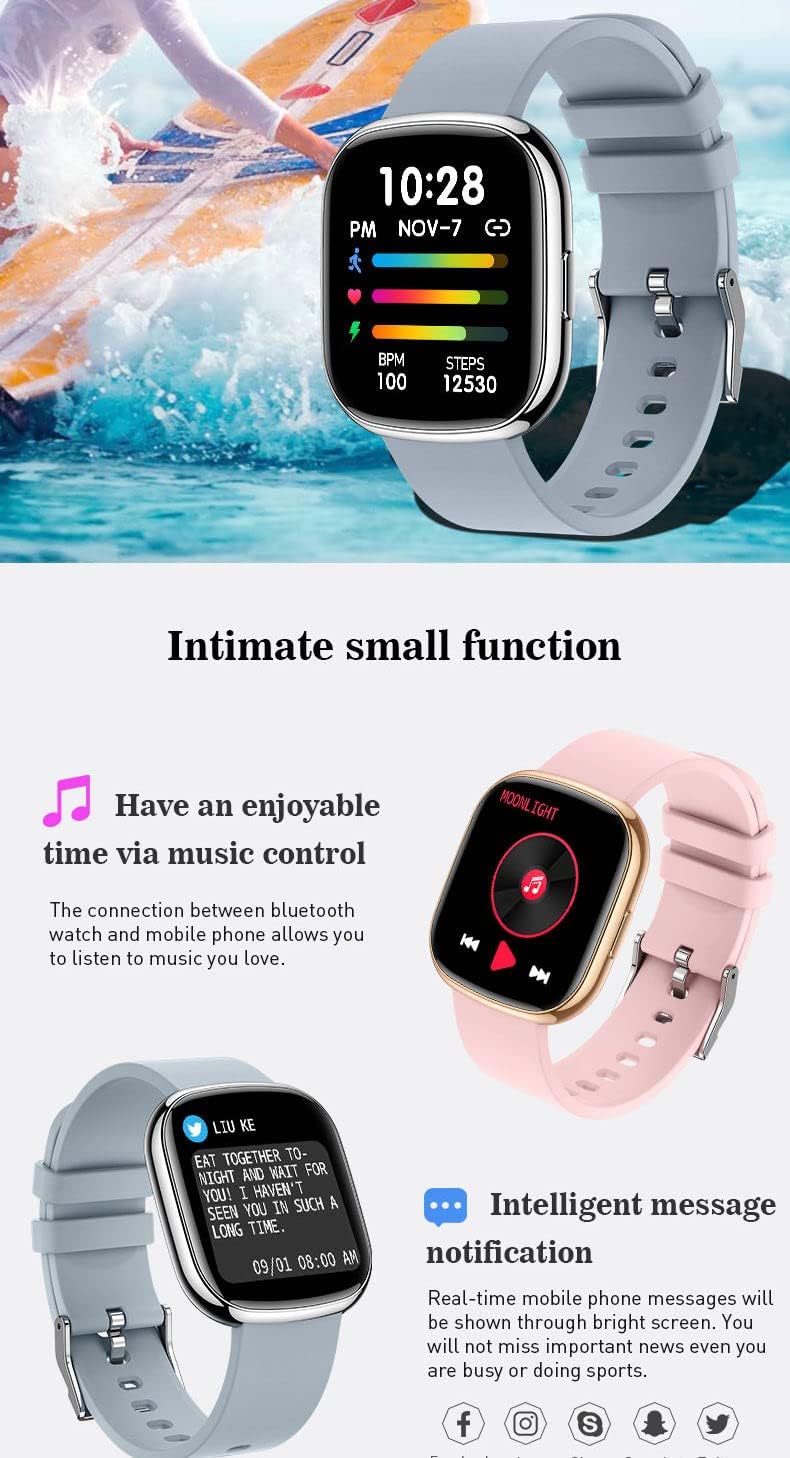 {Notifications} Notifications are clearly visible and easily readable. You can choose lots of different popular apps to give notifications, for example, WhatsApp, Twitter, Facebook, Instagram, SMS, WeChat, and other apps are supported.You can also access call or message notifications with many other functions such as stopwatch, alarm, calendar, reminders to be mobile , remote control of the camera to take selfies with a touch on the screen, and you can control the music from your watch