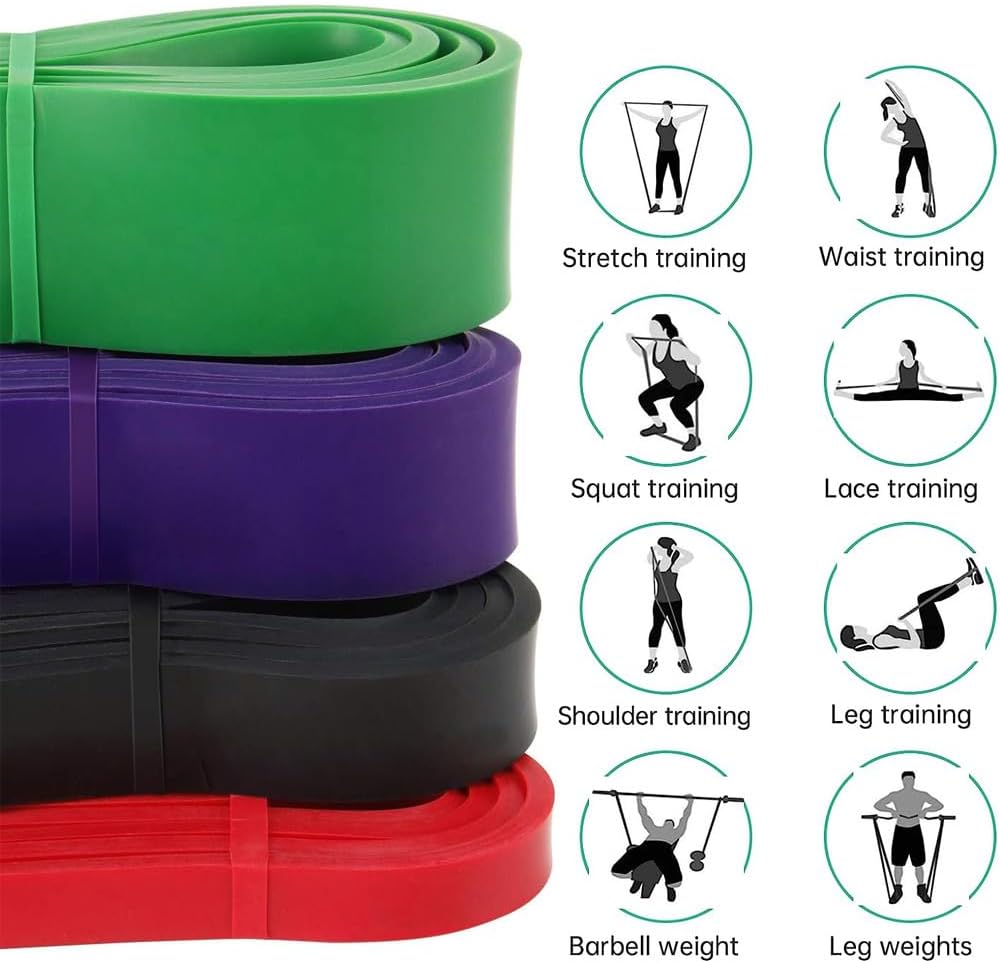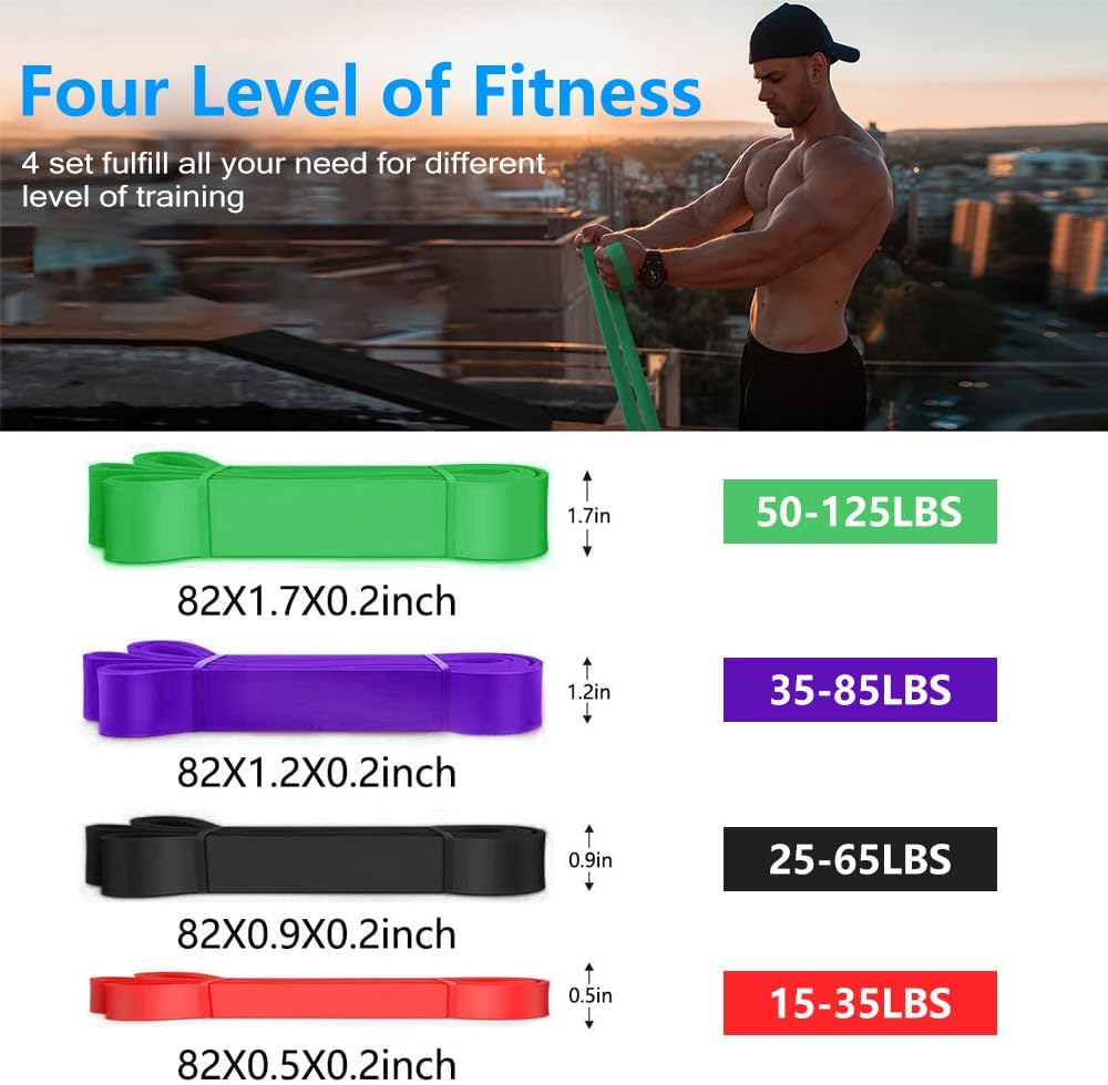 【4 Resistance Bands Levels】Pull up assist bands come in 4 resistance levels, and each color is different resistance and width for different purposes. Red Band (15 – 35 lbs) ; Black Band (25 – 65 lbs); Purple Band (35 – 85 lbs);Green (50-125lbs) .