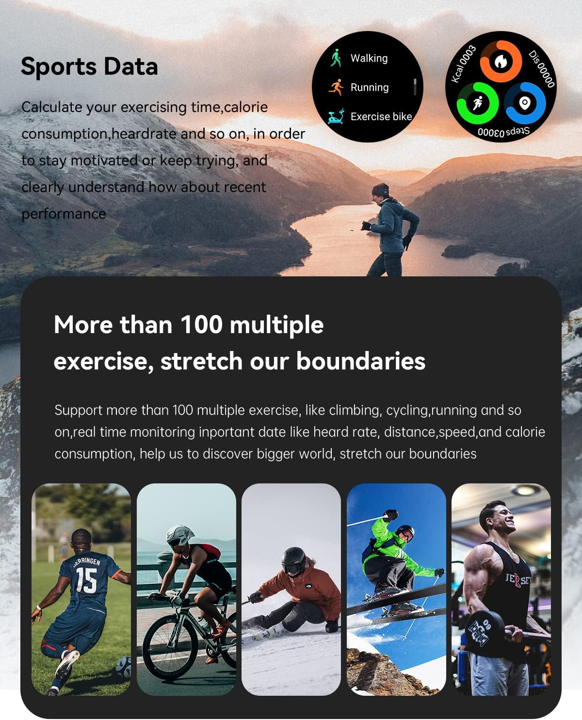 A smartwatch with a large 1.39″ face. This round smartwatch features an IPS touch screen with wider viewing angles, higher resolution, eco-friendly, vibrant colours, saturated images and natural quality. This outdoor smartwatch for men has a screen resolution of 360*360 and 128MB of flash memory. whether you are doing outdoor sports or indoor workouts, this men’s fitness tracker smartwatch with AI voice assistant function frees your hands and will give you a whole new experience.
